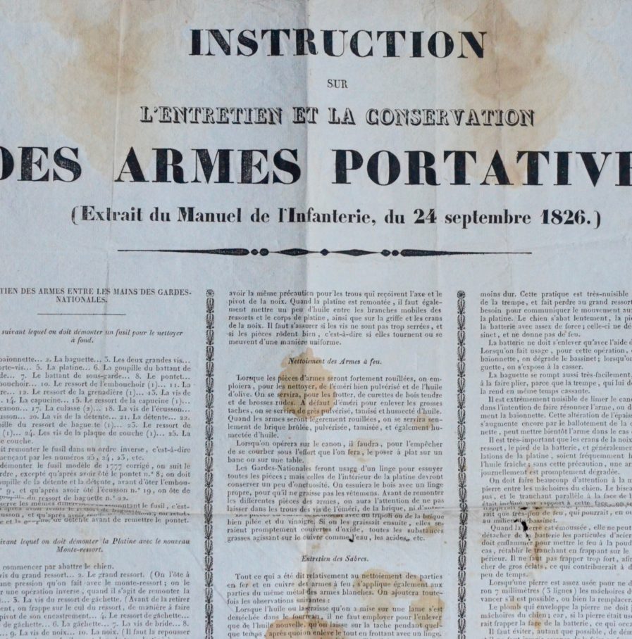 Affiche imprimée : "Instructions sur l'entretien et la conservation des armes portatives. (Extrait du manuel de l'Infanterie, du 24 septembre 1826.)".