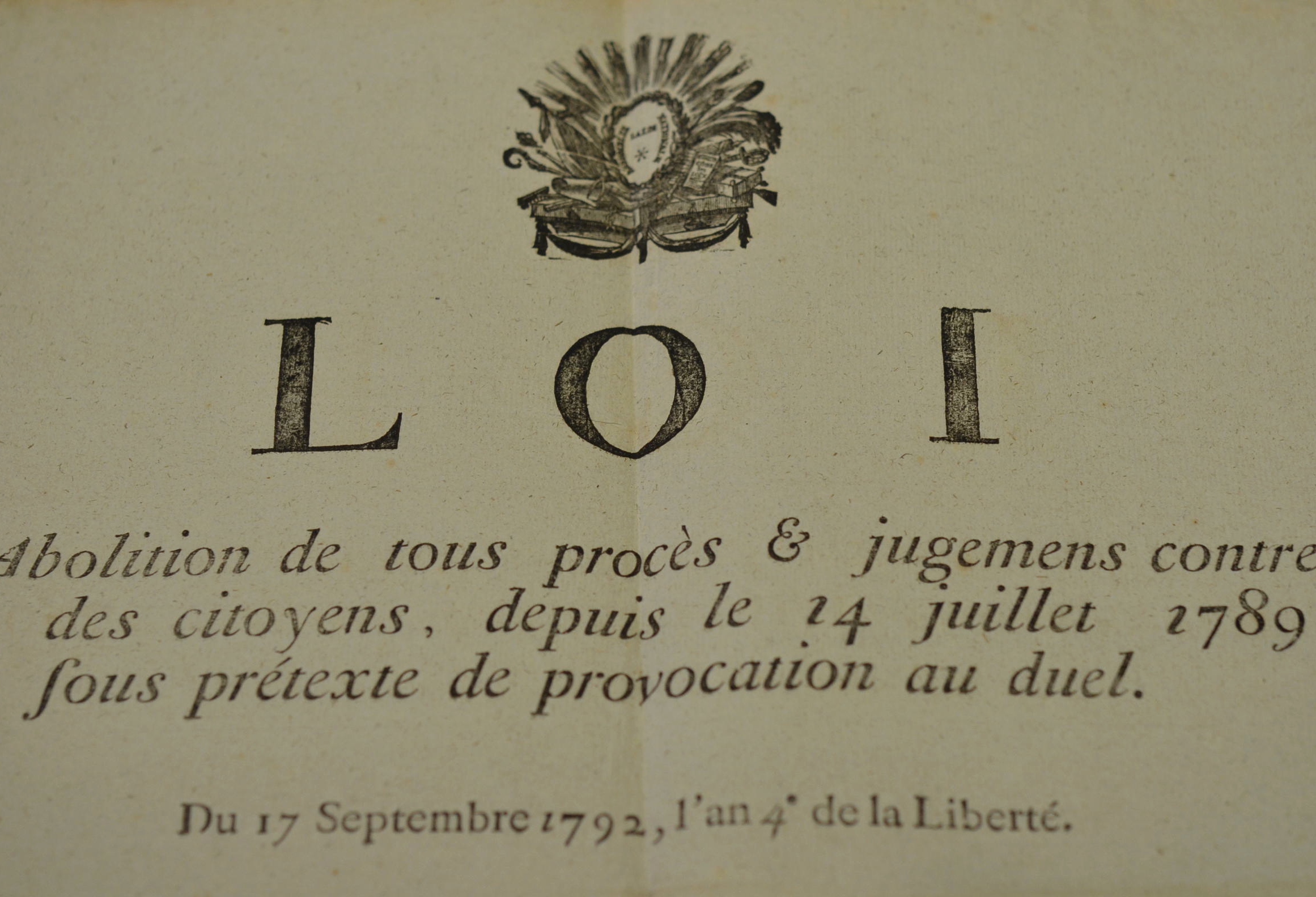 Affiche : "Loi. Abolition de tous procès & jugemens contre les citoyens, depuis le 14 juillet 1789, sous prétexte de provocation de duel", par Danton.