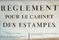 Affiche révolutionnaire : Règlement pour le Cabinet des Estampes [possiblement du musée des Beaux-arts de Dijon]. "Article premier. Le cabinet des estampes sera ouvert au public tous les quintidis, depuis midi jusqu'à deux heures. 2. Le Conservateur communiquera les livres d'estampes à tous ceux qui les lui demanderont, excepté aux enfants, à moins qu'ils ne soient accompagnés de leurs parents ou instituteurs [...]".