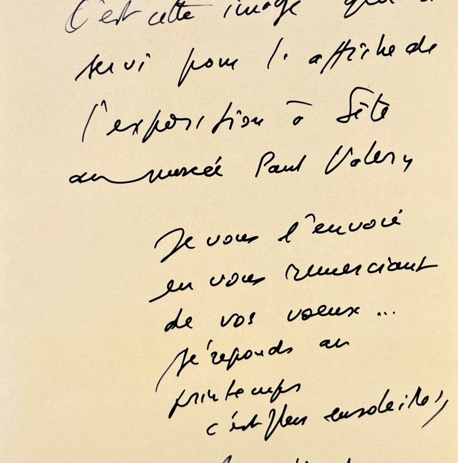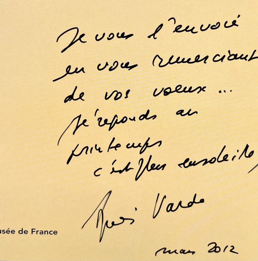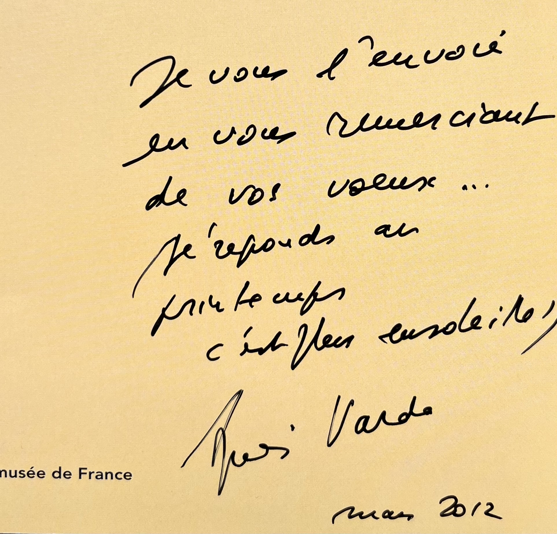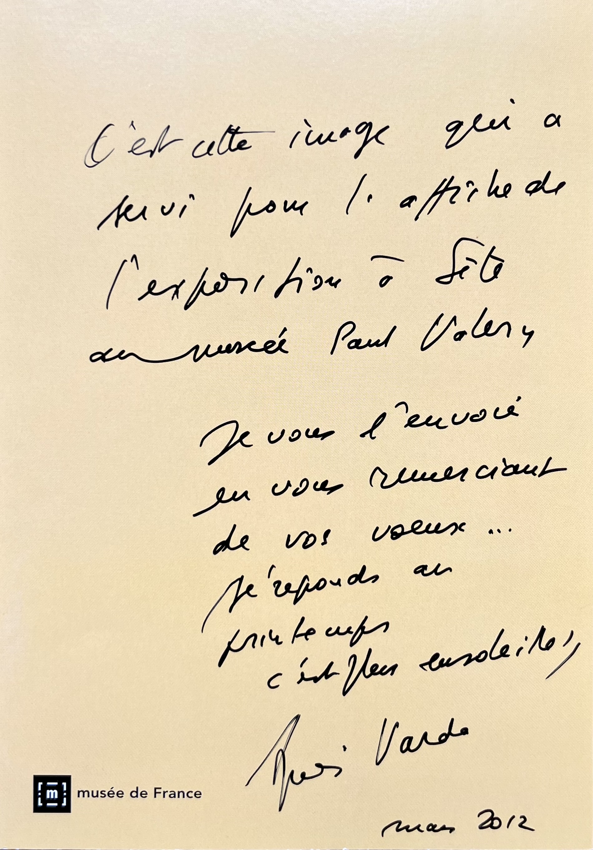 "C'est cette image qui a servi pour l'affiche de l'exposition à Sète au musée Paul Valery. Je vous l'envoie en vous remerciant de vos vœux. Je réponds au printemps, c'est plus ensoleillé, Agnès Varda".