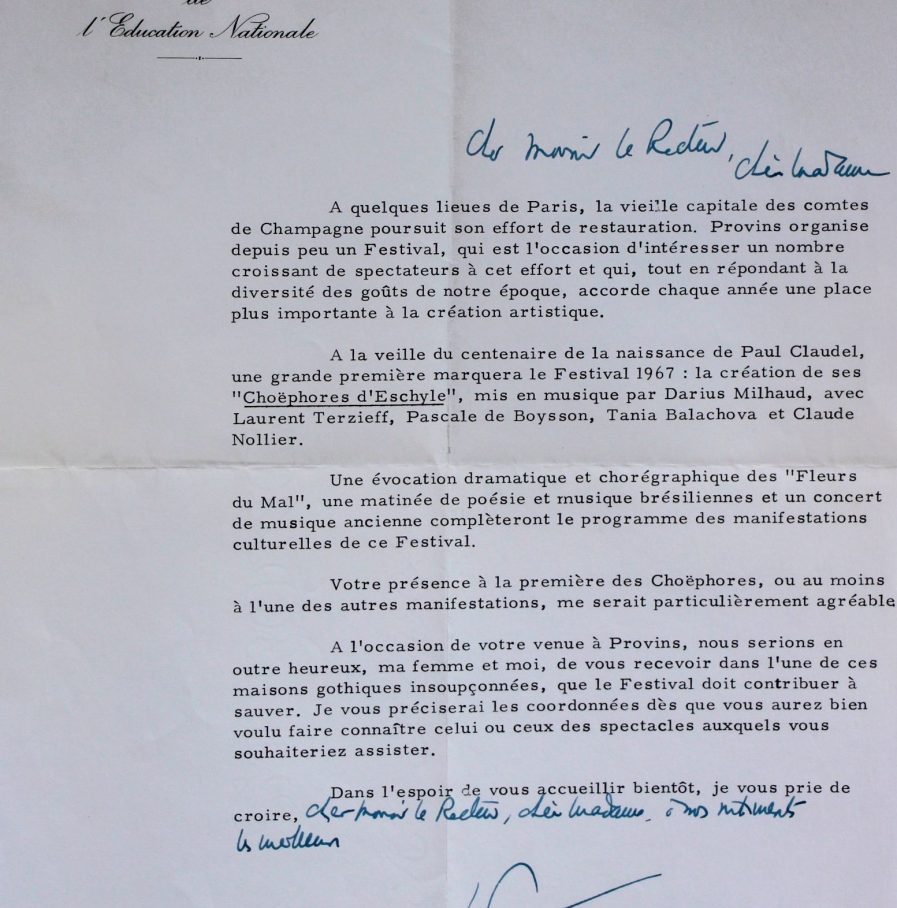 Alain Peyrefitte (Najac, 1925/1999)Comme maire de Provins, Alain Peyrefitte annonce la création d'une pièce de Claudel pour le festival. "A quelques lieues de Paris, la vieille capitale des comtes de Champagne poursuit son effort de restauration. Provins organise depuis peu un Festival, qui est l'occasion d'intéresser un nombre croissant de spectateurs à cet effort qui, tout en répondant à la diversité des goûts de notre époque, accorde chaque année une place plus importante à la création artistique. A la veille du centenaire de la naissance de Paul Claudel, une grande première marquera le Festival 1967 : la création de ses "Choëphores d'Eschyle", mis en musique par Darius Milhaud, avec Laurent Terzieff, Pascale de Boysson [...]. Une évocation dramatique et chorégraphique des "Fleurs du Mal", une matinée de poésie et musique brésilienne et un concert de musique ancienne complèteront le programme des manifestations culturelles de ce Festival [...]". Il invite Jean Roche à ces différentes manifestations.