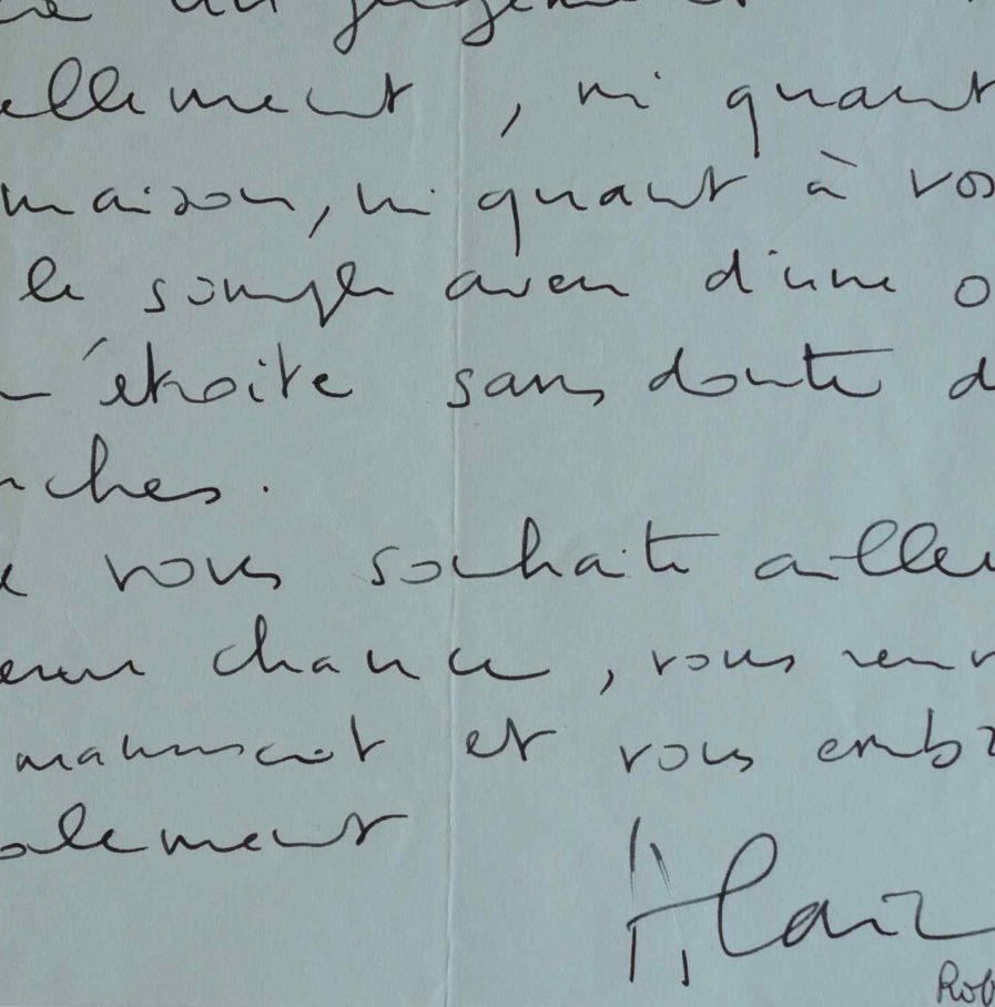 Signée du prénom. Ajout du nom Robbe-Grillet en dessous, d'une autre main.
