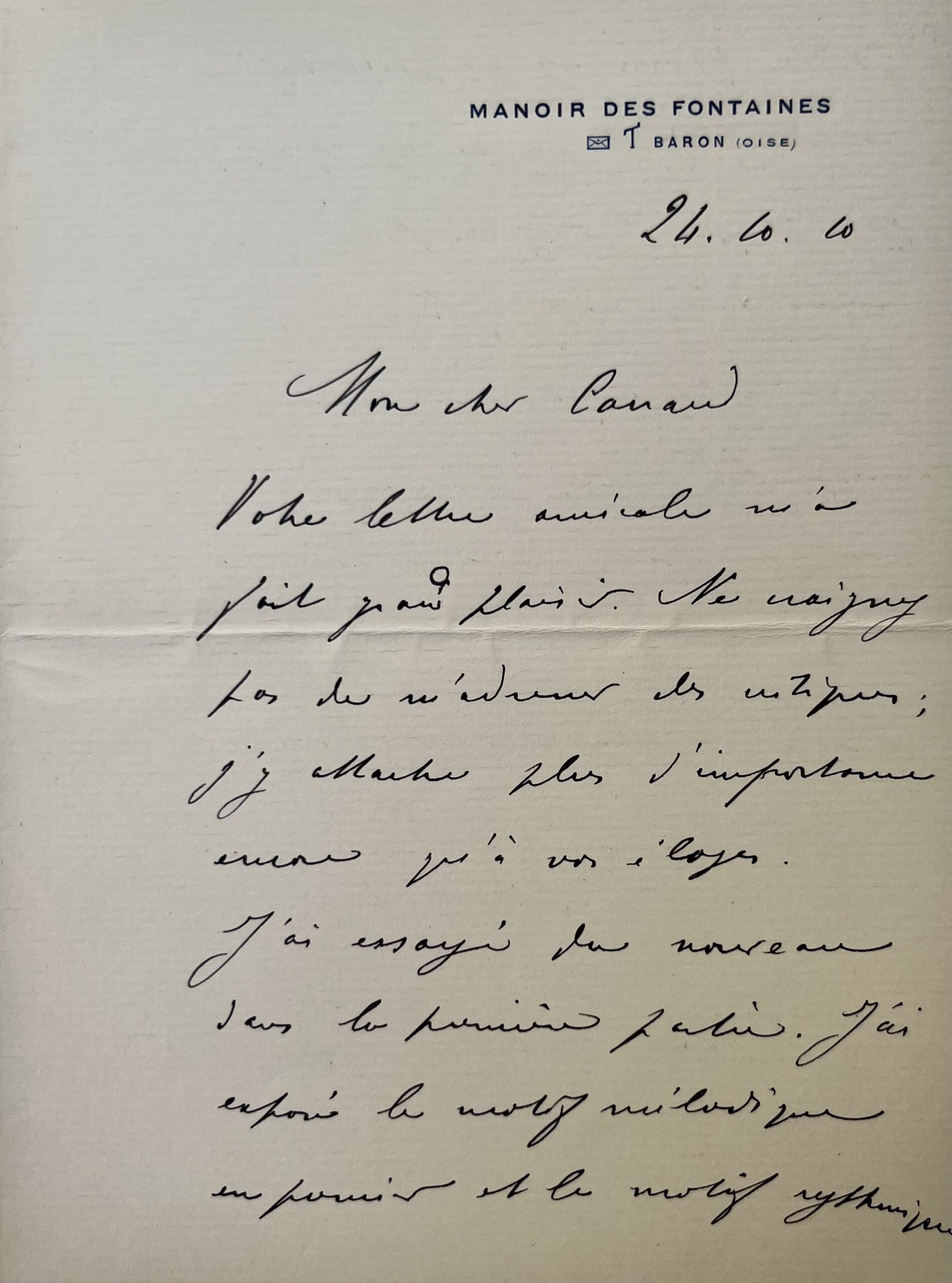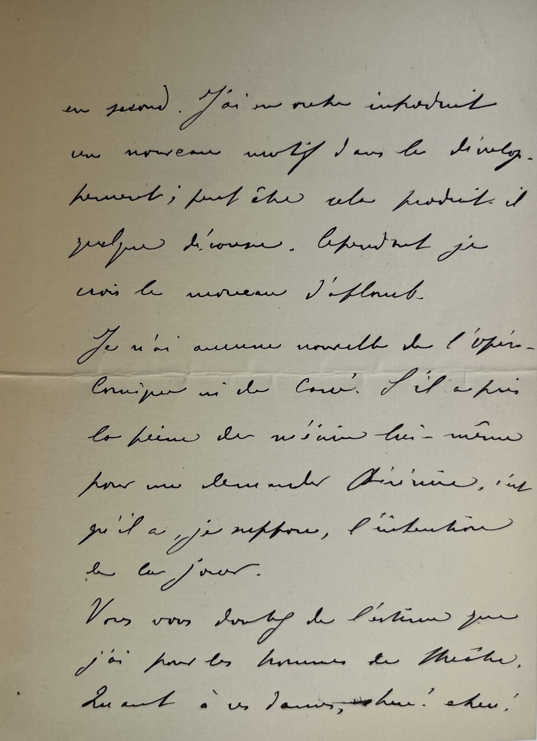 "Votre lettre amicale m’a fait grand plaisir. Ne craignez pas de m’adresser des critiques ; j’y attache plus d’importance encore qu'à vos éloges. J’ai essayé du nouveau dans la première partie. J’ai exposé le motif mélodique en premier et le motif rythmique en second. J’ai en outre introduit un nouveau motif dans le développement ; peut-être cela produit-t-il quelque (découpe ?). Cependant, je crois le morceau d’aplomb. Je n’ai aucune nouvelle de l’Opéra-Comique, ni de Carré [Albert Carré (, son directeur]. S’il a pris la peine de m’écrire lui-même pour me demander Bérénice, c’est qu'il a, je suppose, l’intention de la jouer. Vous vous doutez de l’estime que j’ai pour les hommes de théâtre [...]".