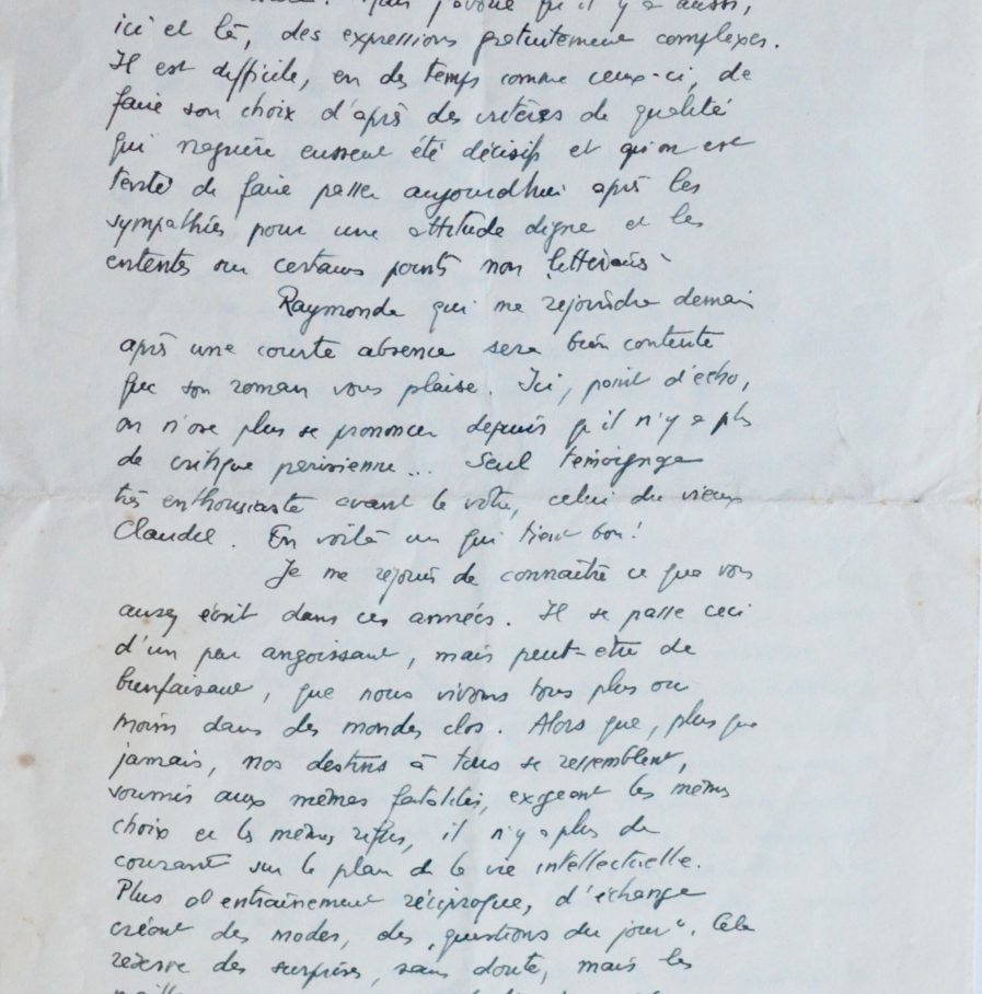 « [...] J'essaie de vous faire parvenir ceux des cahiers que vous n'avez pas eus. Les deux Aragon d'abord, et puis les deux qui portent ma signature. Je tenais beaucoup à vous les faire lire, parce que, le premier surtout, sorte de propagande de mon entreprise, je les ai écrits uniquement à l'intention des amis français dont je suis séparé. Mon «Péguy» n'est qu'une esquisse, que dépasse largement en importance celui d'André Rousseaux (avec qui je me suis beaucoup lié durant mes voyages à Lyon et dans la Drôme, l'ayant connu au moment où je cherchais, en quarante, qui pourrait me donner de vos nouvelles. J'achève ces jours-ci mon livre sur Bloy. Edmond Jaloux et ce pauvre Chenevière me reprochent amèrement de n'avoir pas plutôt poursuivi mes travaux de traducteur et d'introducteur d'un esprit étranger qu'ils admirent plus que jamais... Moi, j'ai tourné le dos à tout cela. Impossible ! [...] Hélas on ne peut pas ici être beaucoup plus direct qu'ailleurs, et il est devenu nécessaire d'écrire parfois en filigrane pour pouvoir imprimer. Sans compter que la plupart des auteurs vivent en France, et que d'ailleurs tous nos cahiers sont soumis à une double censure [...]. Ici, point d'écho, on n'ose plus se prononcer depuis qu'il n'y a plus de critique parisienne [...]Seul témoignage très enthousiaste avant le vôtre, celui du vieux Claudel. En voilà un qui tient bon ! [...]». Il réclame également quelques exemplaires de la Revue de Paris du 1er juin 1938 dan lequel avait paru un article de lui "[...] je reçois un mot de Claudel, qui veut bien se dire enchanté de mon amitié".