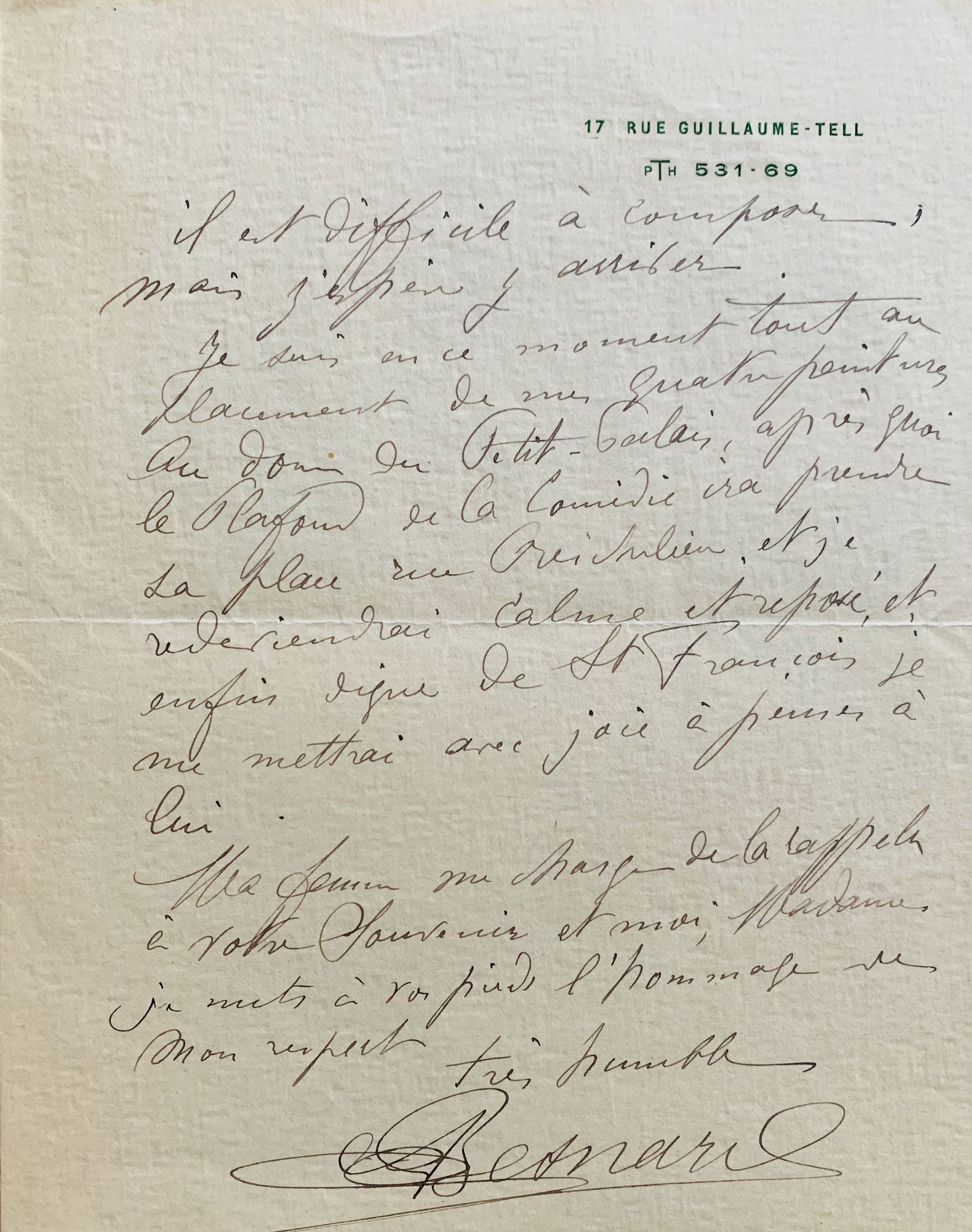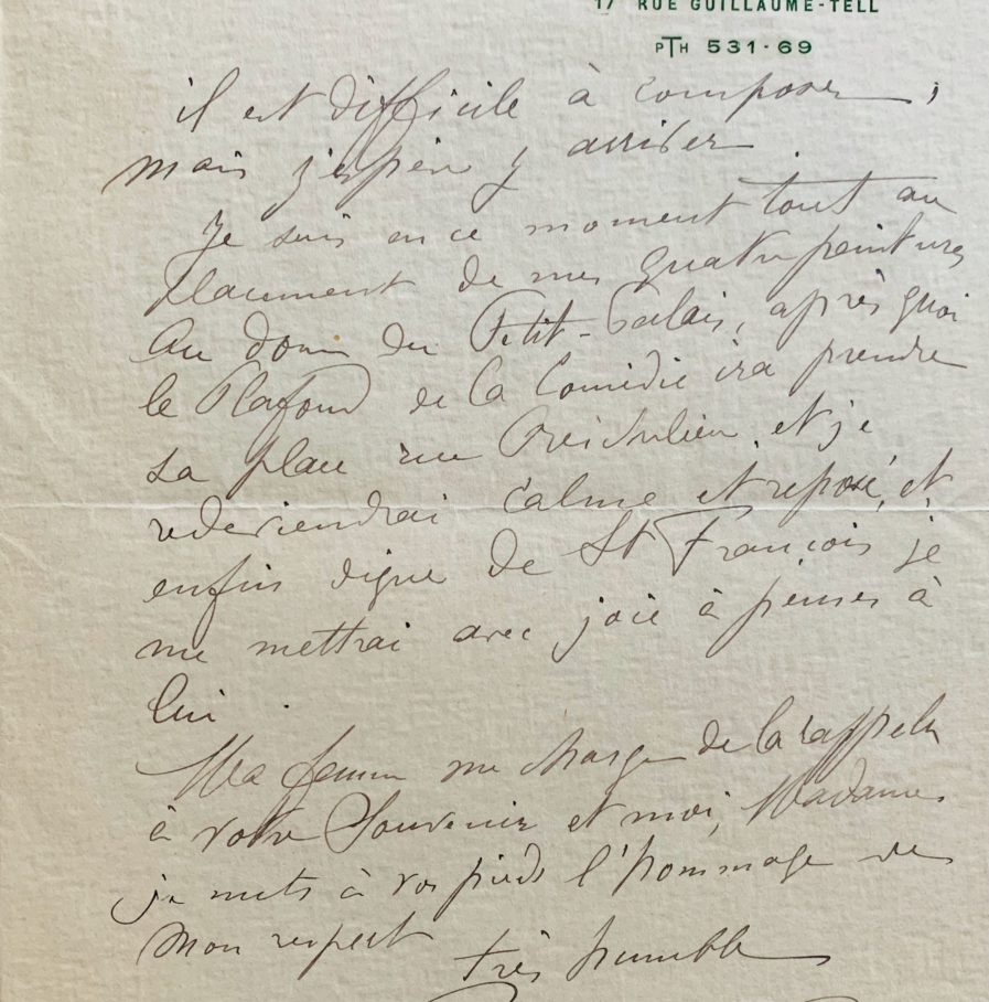 Je suis en ce moment tout au placement de mes quatre peintures au Dôme du Petit-Palais, après quoi le plafond de la Comédie ira prendre sa place rue Richelieu, et je reviendrai calme et reposé, et enfin digne de St François je me mettrai avec joie à penser à lui [...]".