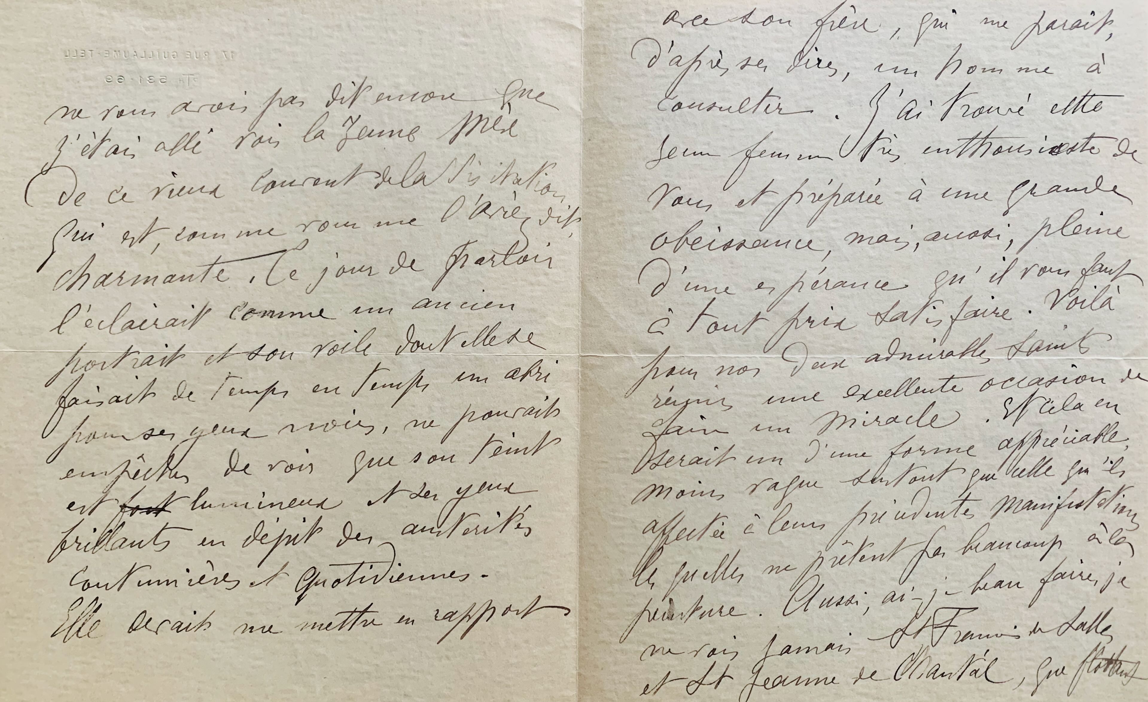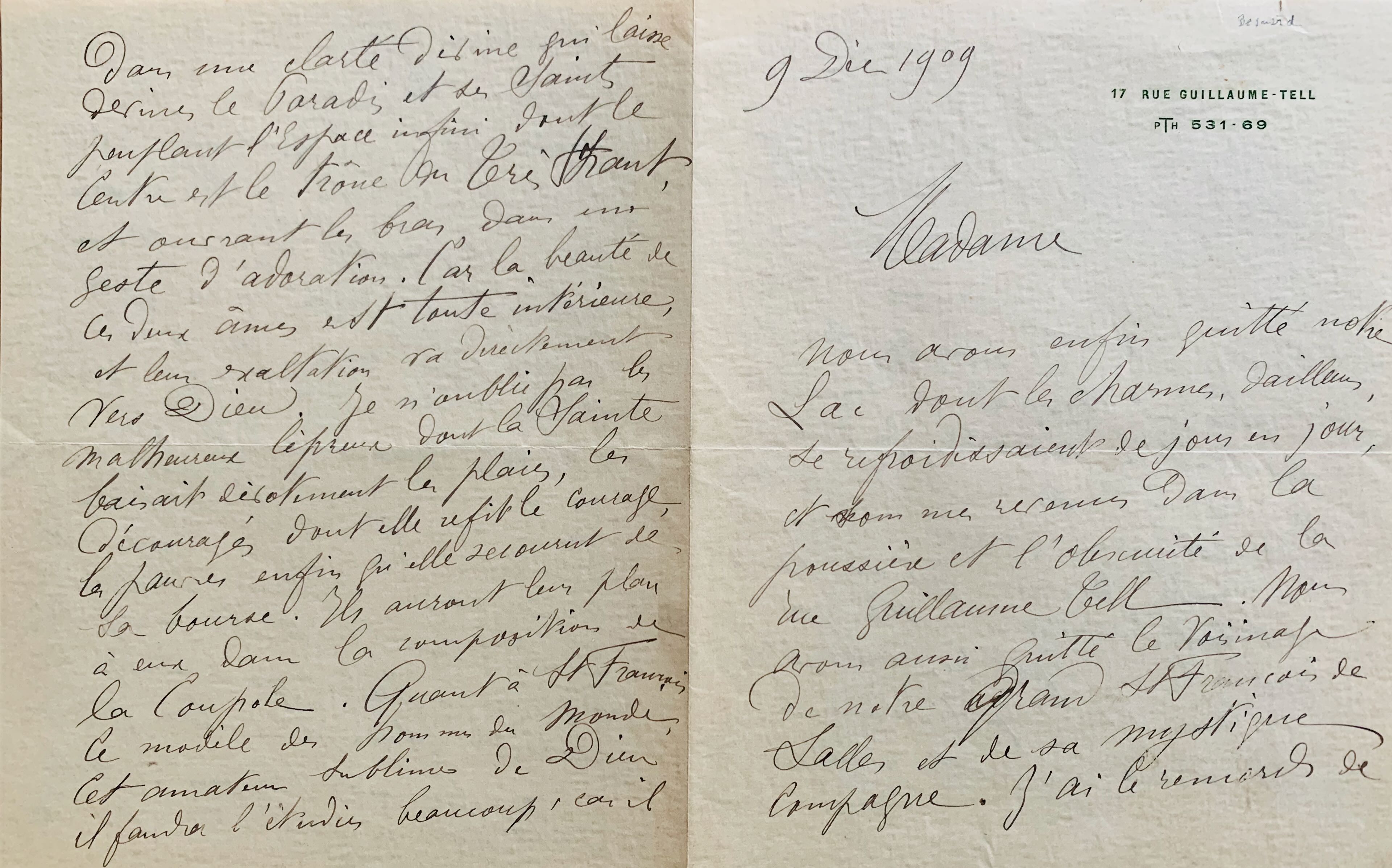 Il revient à Paris après un périple dans la cité de François de Salles [Annecy]. "Nous avons enfin quitté notre lac dont les charmes, d'ailleurs, se refroidissaient de jour en jour et sommes revenus dans la poussière et l'obscurité de la rue Guillaume Tell. Nous avons aussi quitté le voisinage de notre grand St François de Salles et de sa mystique campagne. J'ai le remord de ne vous avoir pas dit encore que j'étais allé voir la jeune mère de ce vieux couvent de la Visitation, qui est, comme vous me l'avez dit, charmante. Ce jour de parloir l'éclairait comme un ancien portrait et son voile dont elle se faisait de temps en temps un abri pour ses yeux noirs, ne pouvait empêcher de voir que son teint est lumineux et ses yeux brillants en dépit des austérités coutumières et quotidiennes [...]. J'ai trouvé cette jeune femme très enthousiaste de vous et préparée à une grande obéissance [...]. Aussi, ai-je beau faire, je ne vois jamais St François de Salles et St Jeanne de Chantal, que flottant dans une clarté divine qui laisse deviner le Paradis et ses saints peuplant l'Espace infini dont le centre est le trône du Très Haut, et ouvrant les bras, dans un geste d'adoration. Car la beauté de ces deux âmes est toute intérieure, et leur exaltation va directement vers Dieu. Je n'oublie pas les malheureux lépreux dont la sainte baisait dévotement les plaies, les découragés dont elle refit le courage, les pauvres enfin qu'elle secourut de sa bourse. Ils auront leur place à eux dans la composition de la Coupole. Quand à St François ce modèle des hommes du monde, cet amateur sublime de Dieu, il faudra l'étudier beaucoup, car il est difficile à composer, mais j'espère y arriver.