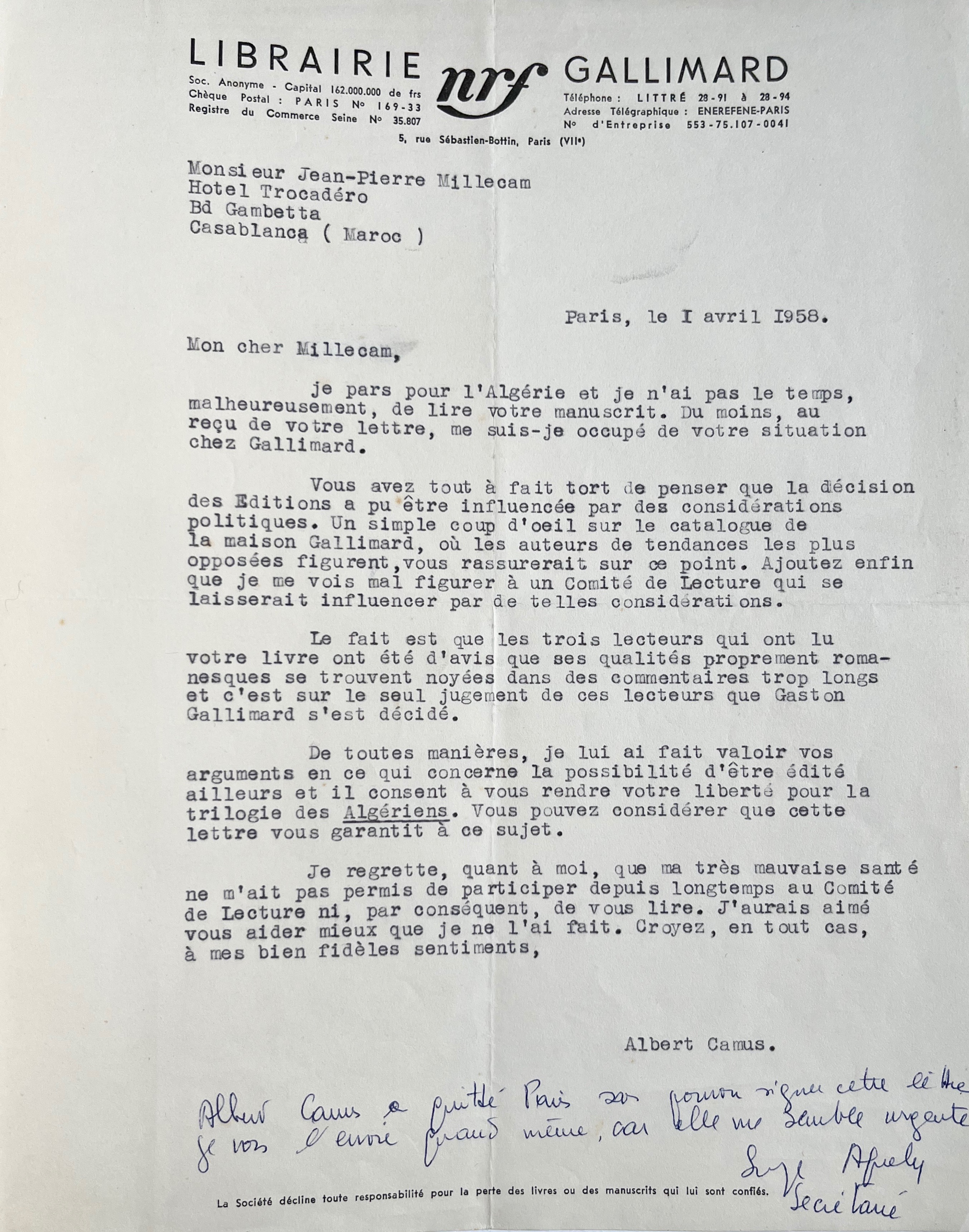 Camus part pour l'Algérie et n'aura pas eu le temps de lire le manuscrit que Millecam lui a envoyé. "Je me suis occupé de votre situation chez Gallimard. Vous avez tout à fait tort de penser que la décision des Editions a pu être influencée par des considérations politiques. Un simple coup d'oeil sur le catalogue de la maison Gallimard, où les auteurs de tendances les plus opposées figurent, vous rassurerait sur ce point. Ajoutez enfin que je me vois mal figurer à un comité de Lecture qui se laisserait influencer par de telles considérations. Le fait que trois lecteurs qui ont lu votre livre ont été d'avis que ses qualités proprement romanesques se trouvent noyées dans des commentaires trop longs et c'est sur le seul jugement de ces lecteurs que Gaston Gallimard s'est décidé. De toutes manières, je lui ai fait valoir vos arguments en ce qui concerne la possibilité d'être édité ailleurs et il consent à vous rendre votre liberté pour la trilogie des Algériens [...]. Je regrette, quant à moi, que ma très mauvaise santé ne m'ait pas permis de participer depuis longtemps au Comité de Lecture [...]".