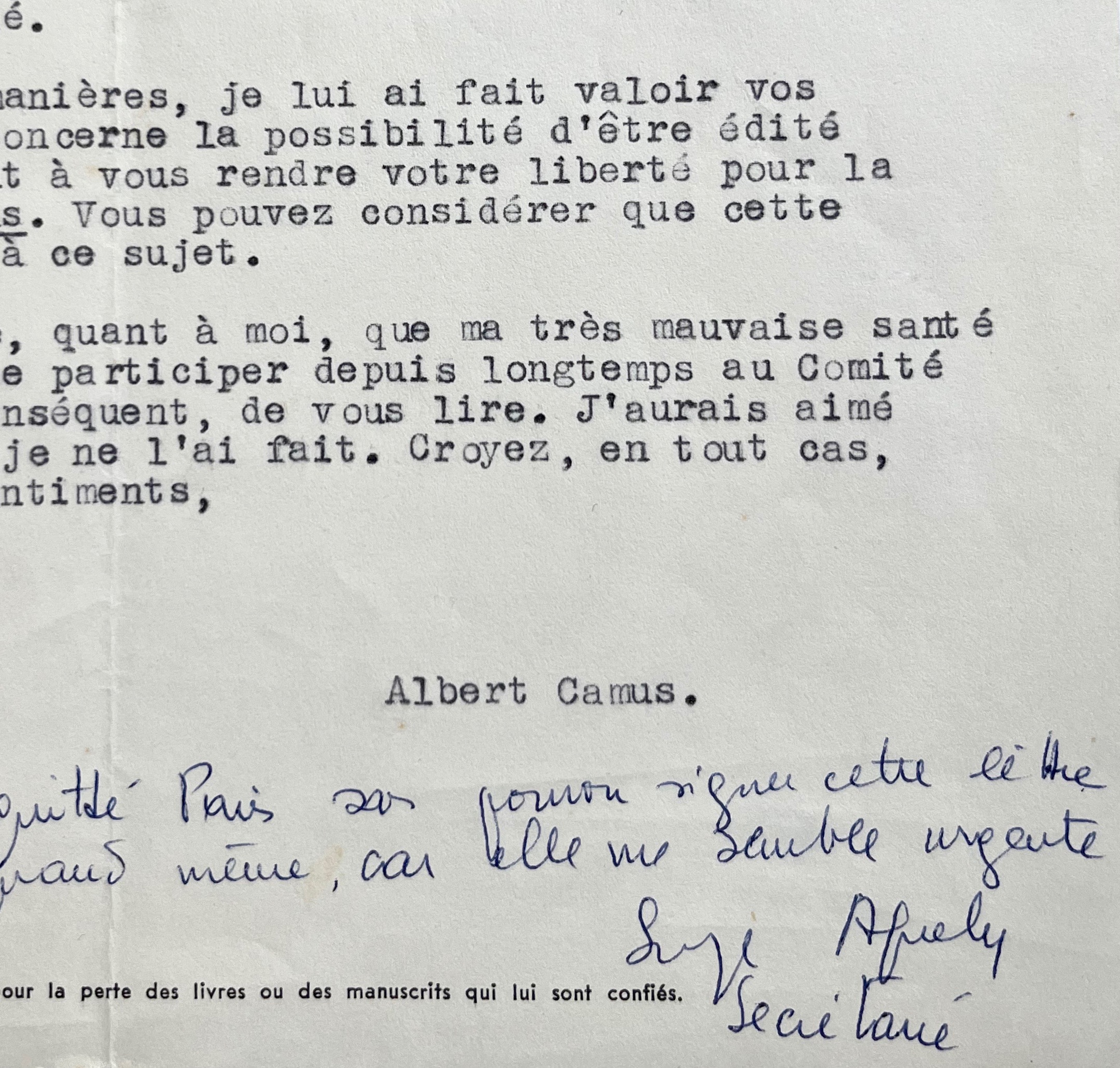 En bas de la lettre figurent deux lignes de la main de la secrétaire de Camus, Suzanne Agnely. « Albert Camus a quitté Paris sans pouvoir signer cette lettre. Je vous l'envoie quand même, car elle me semble urgente [...] ».