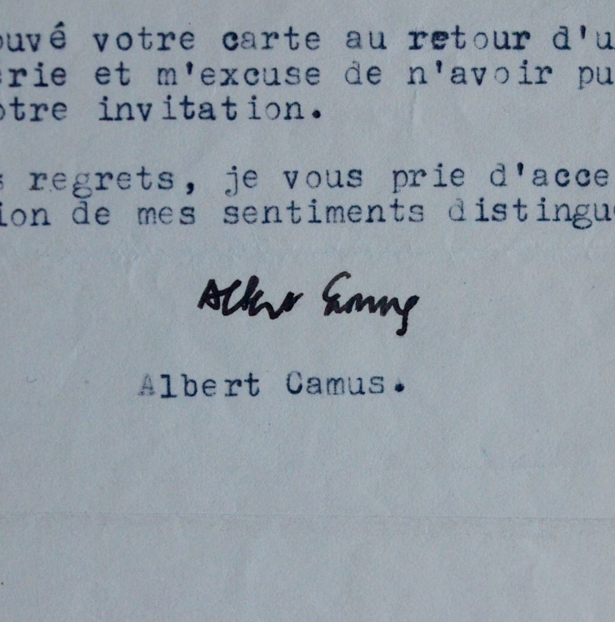 Camus regrette de n'avoir pu honorer l'invitation de Dalinval : "J'ai trouvé votre carte au retour d'un voyage en Algérie [...]".