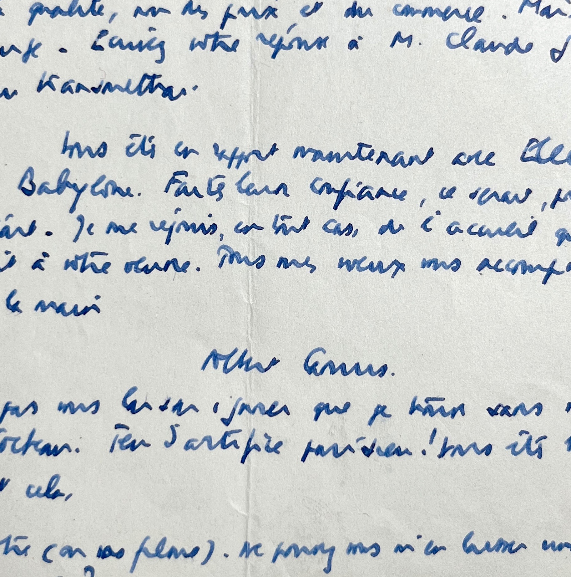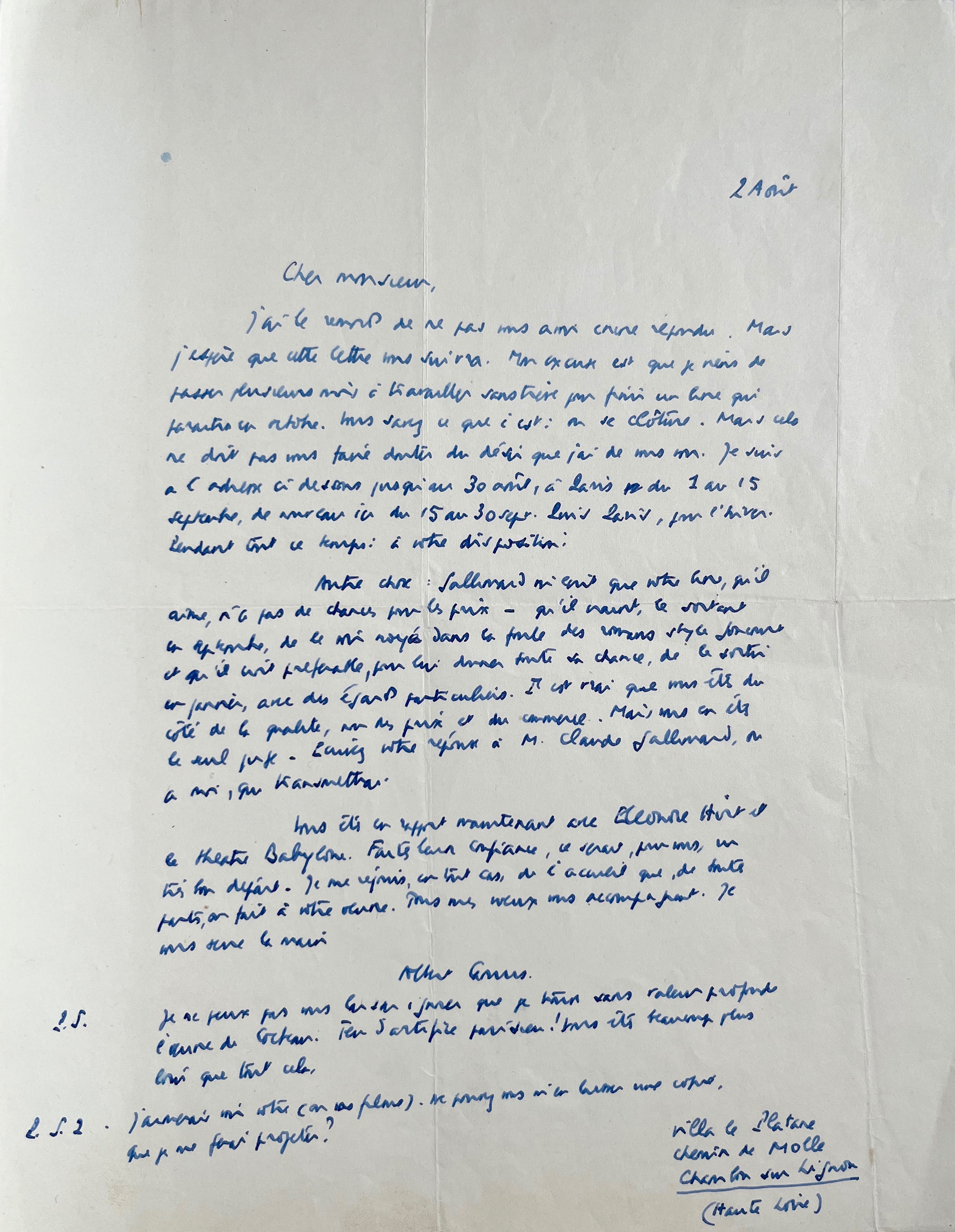 "Autre chose : [Claude] Gallimard m'écrit que votre livre, qu'il aime, n'a pas de chances pour les prix - qu'il craint, le sortant en septembre, de le voir noyé dans la foule des romans style Goncourt et qu'il croit préférable, pour lui donner toute sa chance, de le sortir en janvier, avec des égards particuliers. Il est vrai que vous êtes du côté de la qualité, non des prix et du commerce. Mais vous en êtes le seul juge". Camus évoque ensuite l'actrice Eléonore Hirt et le Théâtre Babylone avec qui son correspondant est en contact. "Faites leur confiance, ce serait, pour vous, un très bon départ. Je me réjouis, en tout cas, de l'accueil que, de toute parts, on fait à votre oeuvre [...]".