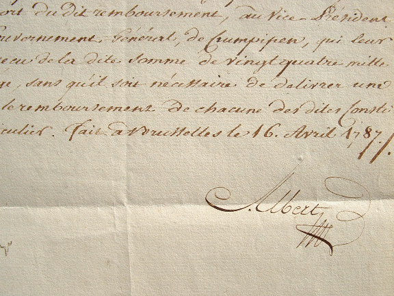 Procuration signée conjointement par Albert de Saxe-Teschen et Marie de Habsbourg-Lorraine, alors gouverneurs des Pays-Bas autrichiens, pour recevoir 24.000 florins d'une rente de 96.000 léguée par la princesse Charlotte de Lorraine.
