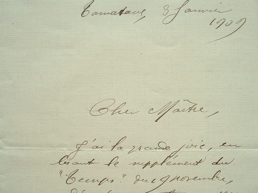 Albert Garenne, qui fit, comme officier, plusieurs séjours à Madagascar [il y fut décoré pour faits de guerre en 1898], attend sa mutation [pour le Tonkin]. «J'ai la grande joie, en lisant le supplément du Temps, du 19 novembre, d'y trouver votre nom pour les lauréats de l'Académie [...]. Je vois une heureuse coïncidence dans ce fait que c'est le prix Furtado qui vous est échu. Le sonnet à madame Furtado que j'ai inséré dans mon nouveau volume de vers, sera, je l'espère, un titre à l'indulgence de madame Rivollet, à qui j'ai dédié audacieusement le volume. J'attends tous les jours ma nomination [...]».