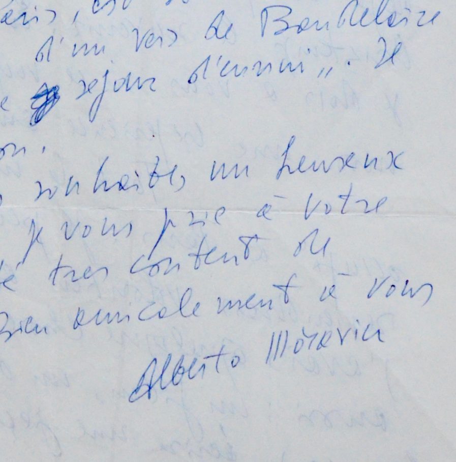 Il gardera longtemps le souvenir de son séjour à Paris : "En grande partie je dois à vous si ce voyage a été pour moi une expérience aussi heureuse [...]. Je pense que j’y reviendrais volontiers au plus tôt si j’avais quelque chose à faire moi aussi : un film, un drame. J’aimerais beaucoup écrire une pièce pour Jeanne Moreau même si ensuite ce ne soit pas elle à la jouer [...]". Il a recommencé à travailler et espère finir son roman [L’Ennui ?] dans deux mois : "[...] La vie de Rome en comparaison avec celle de Paris est somnolente. Je me souviens d'un vers de Baudelaire qui dit "Rome séjour d'ennui". Il avait bien raison [...]".