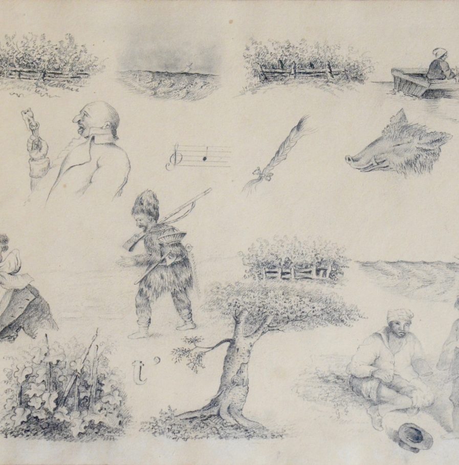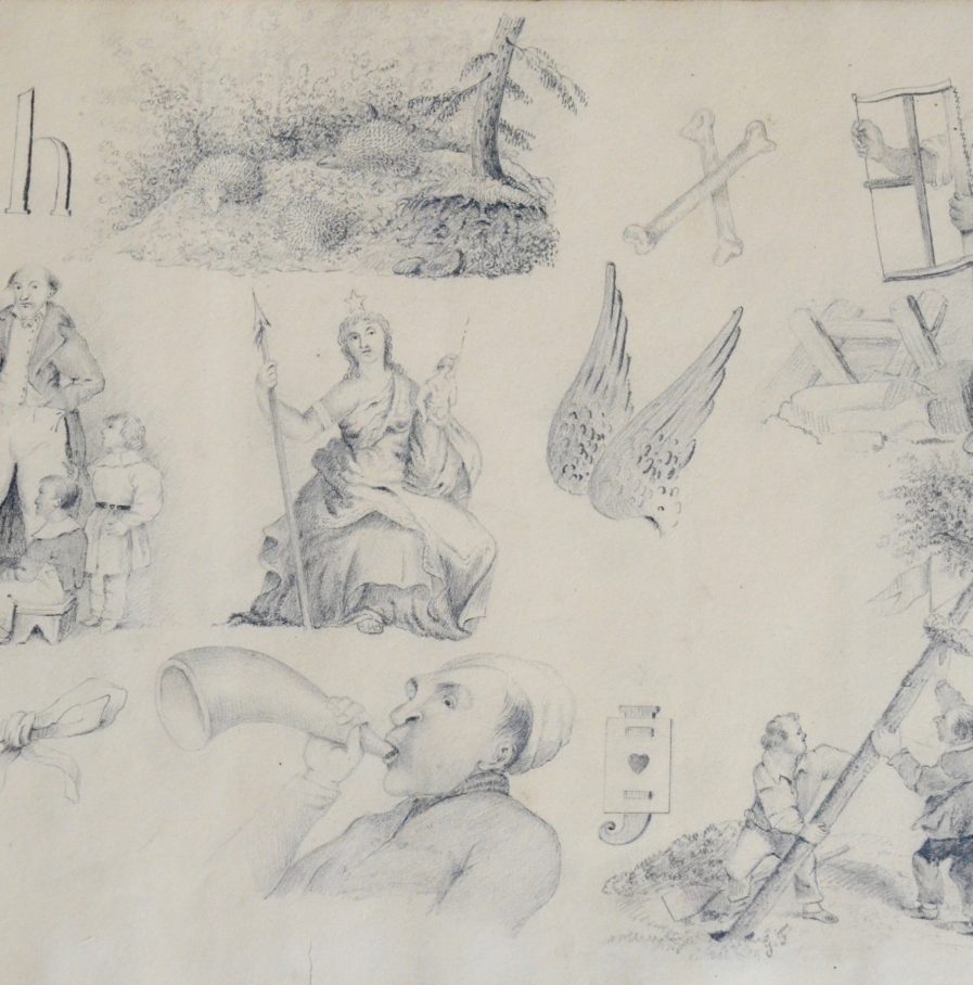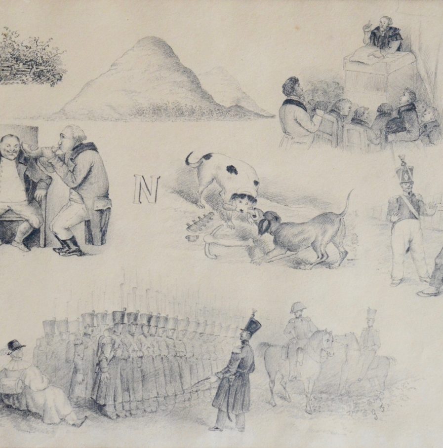 - 20 dessins parfois contrecollés (7 non signés, 4 petits et certains non terminés. Un dessin daté de 1836, Grenoble. Un dessin est signé C du D), représentant des scènes pastorales, des mendiants, des paysages, des villages, etc.