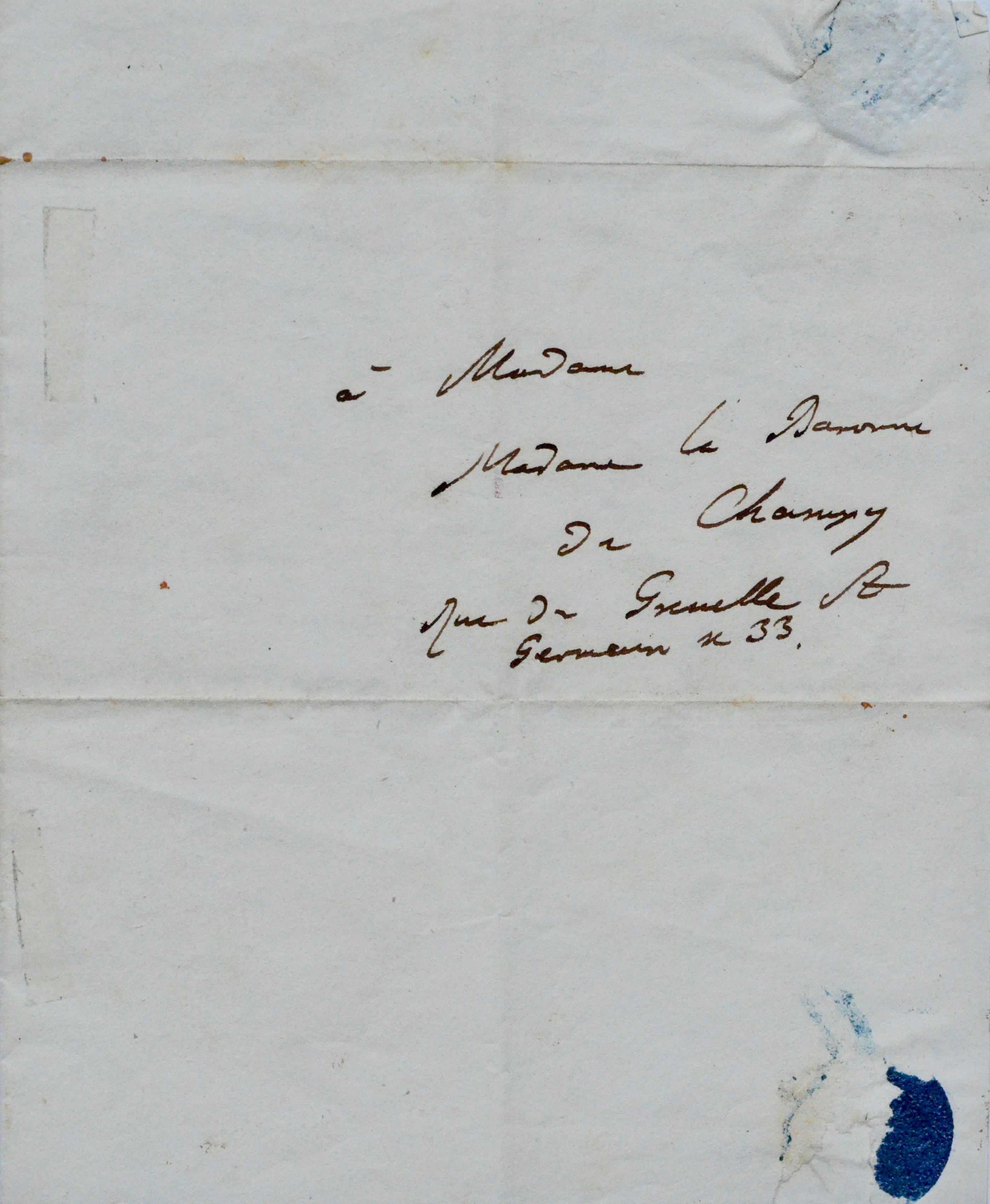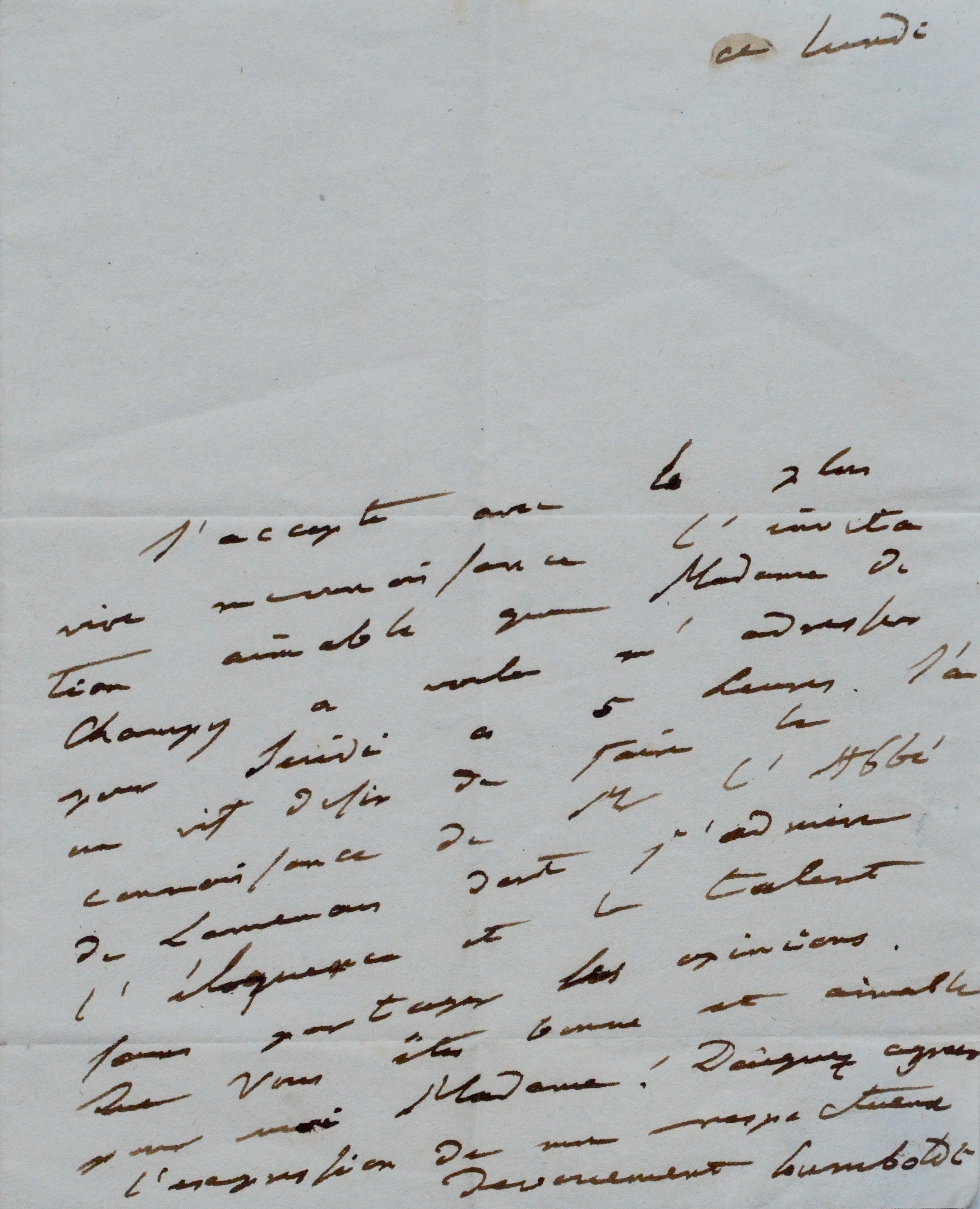 Alexander von Humboldt accepte une invitation de la baronne de Champy, chez elle, afin de rencontrer Lamennais : « [...] j'ai un vif désir de faire la connaissance de M. l'Abbé de Lamennais dont j'admire l'éloquence et le talent sans partager ses opinions. Que vous êtes bonne et aimable pour moi Madame ! […] ».