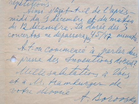 Alexandre Borovsky annonce qu'il va jouer les 3 concertos pour piano de Bach avec le chef d'orchestre Eugène Bigot [qui dirige alors l'orchestre des concerts Lamoureux]. «Est-ce que vous pouvez vous mettre en contact avec M. Bigot pour établir les dates et l'heure fixée des enregistrements [...]. Je ne voudrais pas travailler avant le 8 décembre parce que le concert nous donnera plus de perfection que toutes les répétitions [...]. La durée des 3 concertos ne dépassera pas 45/47 minutes. A-t-on commencé à parler dans la presse des inventions de Bach ? [...]».
