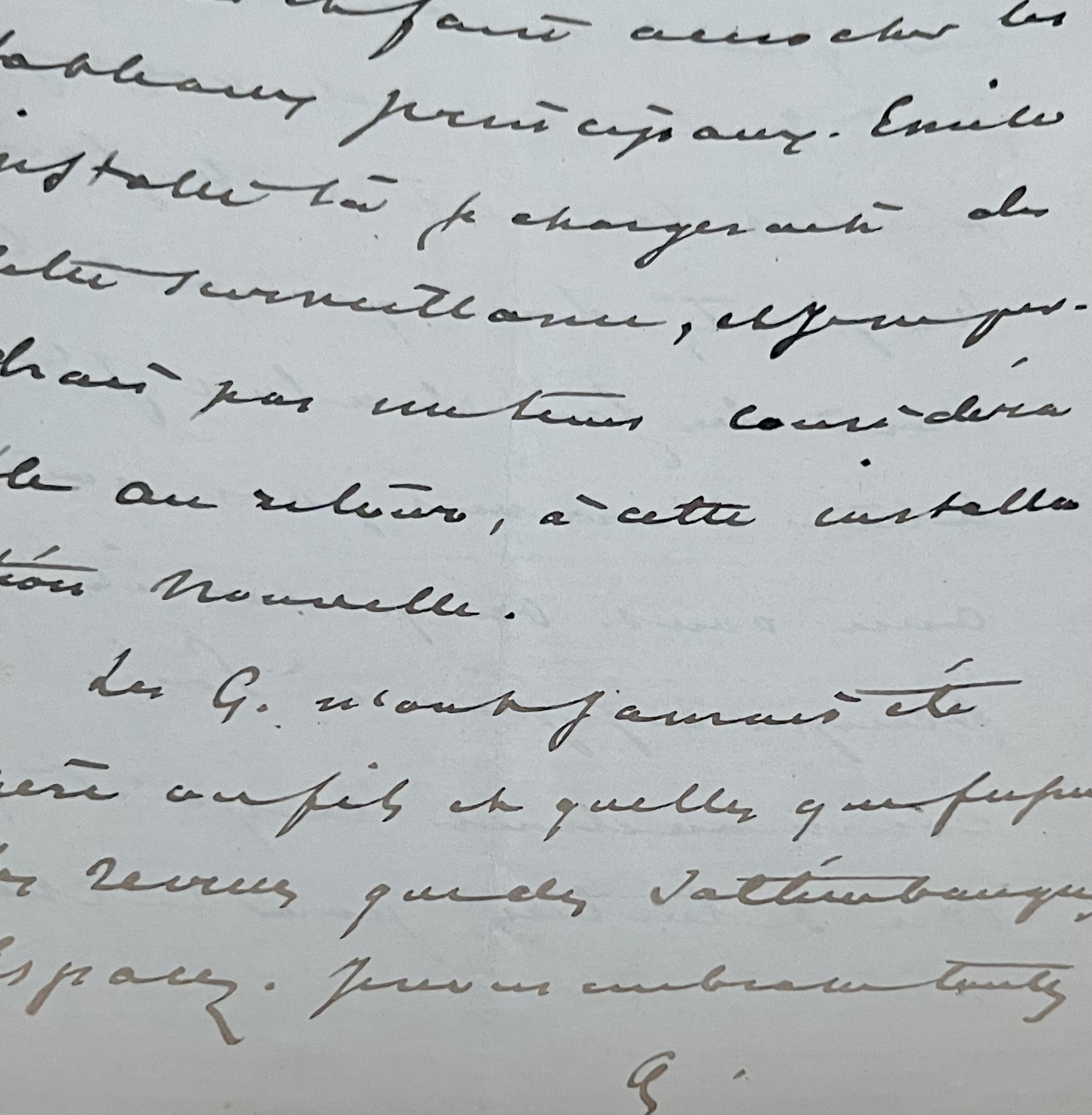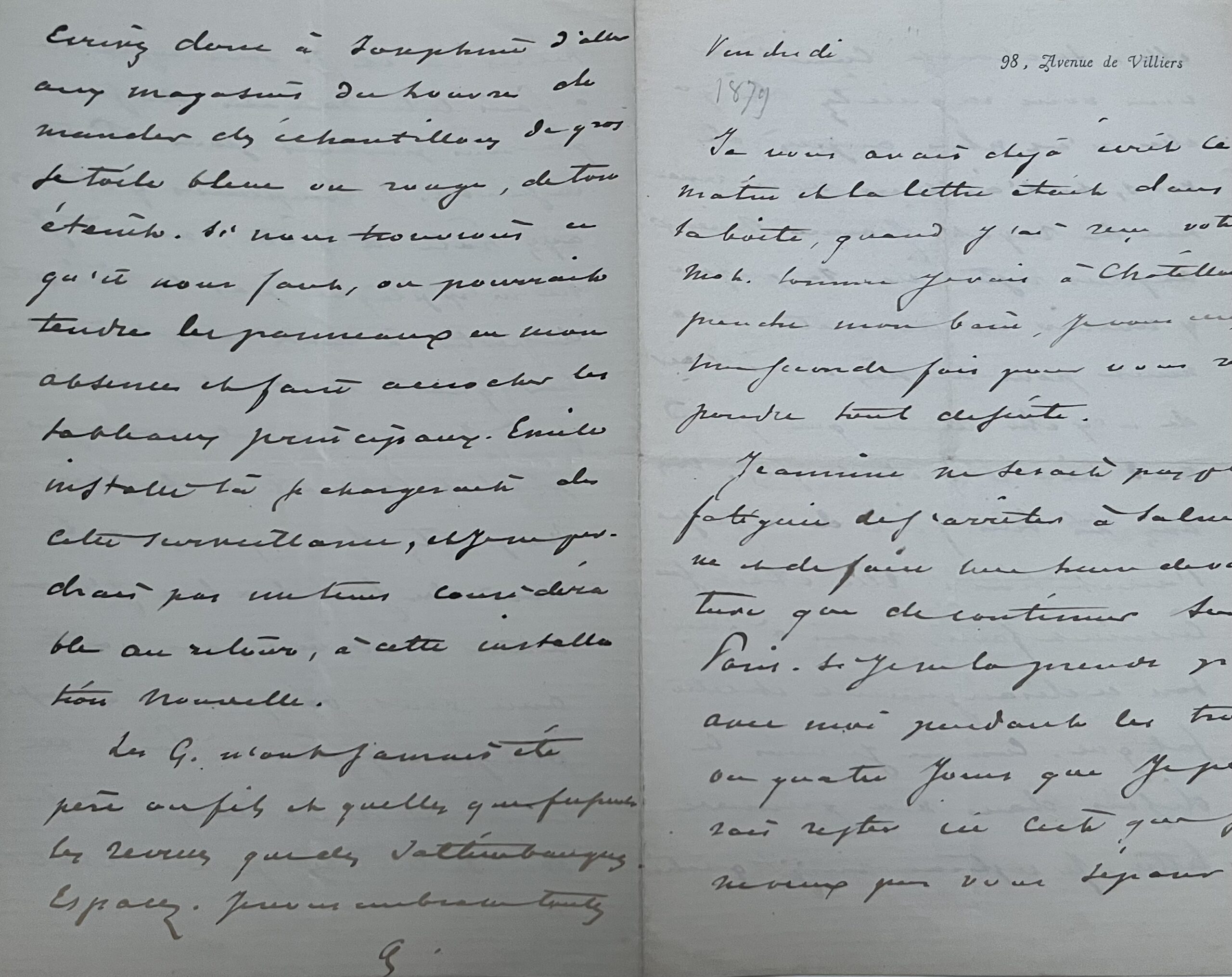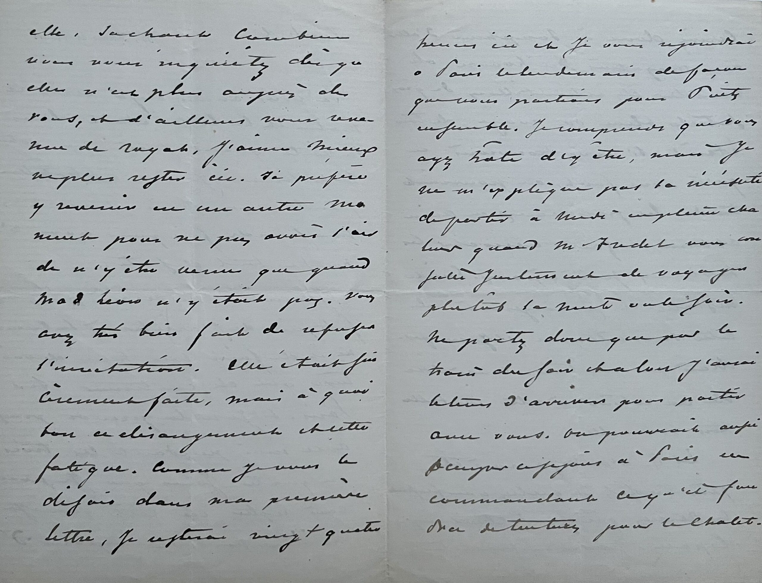 Il part à Châtillon prendre son bain puis ils partiront ensemble à Puys par le train du soir, pour éviter la chaleur. "Jeannine ne serait pas plus fatiguée de s'arrêter à (?) et de faire une heure de voiture que de continuer sur Paris. Si je ne la prends pas avec moi pendant les trois ou quatre jours que je pourrai rester ici c'est que je ne veux pas vous séparer d'elle, sachant combien vous vous inquiétez dès qu'elle n'est plus auprès de vous [...]. J'aime mieux ne plus rester ici. Je préfère y revenir en un autre moment pour ne pas avoir l'air de n'y être venu que quand mad. Léon n'y était pas". Il estime qu'elle a eu raison de refuser l'invitation car elle aurait provoqué des fatigues inutiles. "Comme je vous le disais dans ma première lettre, je resterai vingt quatre heures ici et je vous rejoindrai à Paris le lendemain de façon que nous partions pour Puits [Puys] ensemble. Je comprends que vous ayez hâte d'y être, mais je ne m'explique pas la nécessité de partir à midi en pleine chaleur [...]. Ne partez donc que par le train du soir et alors j'aurai le temps d'arriver pour partir avec vous. On pourrait aussi occuper ce séjour à Paris en commandant ce qu'il faudrait de tentures pour le chalet. Ecrivez donc à Joséphine d'aller aux magasins du Louvre demander des échantillons de grosse toile bleue ou rouge. Si nous trouvons ce qu'il nous faut, on pourrait tendre les panneaux en mon absence et faire accrocher les tableaux principaux [...]".