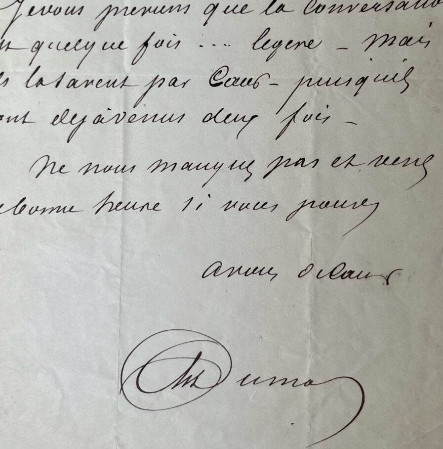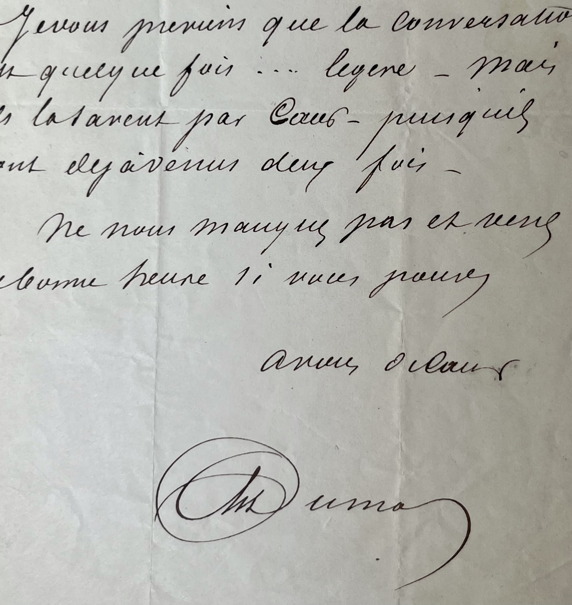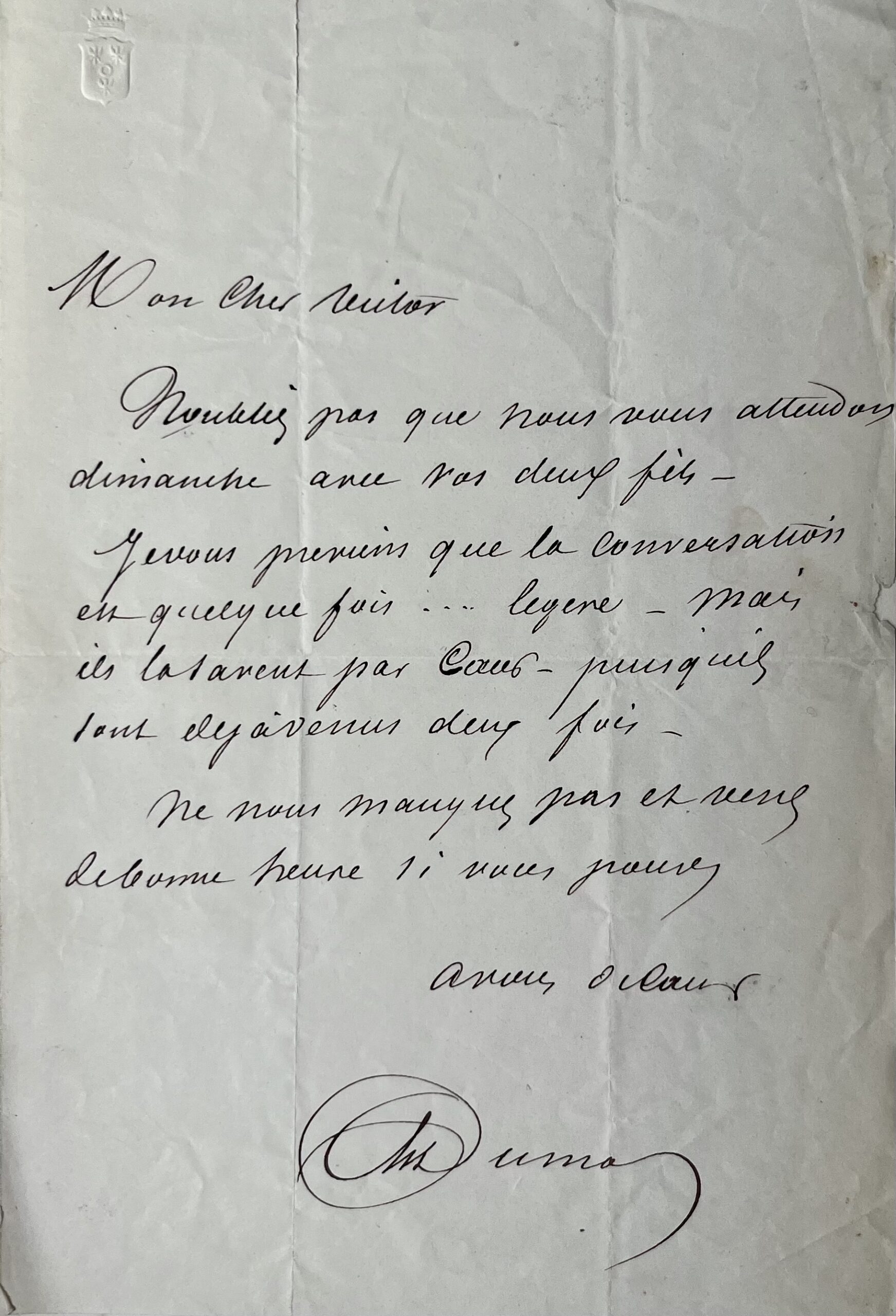 "Mon Cher Victor. N'oubliez pas que nous vous attendons dimanche avec vos deux fils. Je vous préviens que la conversation est quelque fois... légère. Mais ils la savent par coeur - puisqu'ils sont déjà venus deux fois. Ne nous manquez pas et venez de bonne heure si vous pouvez. A vous de coeur. A Dumas".