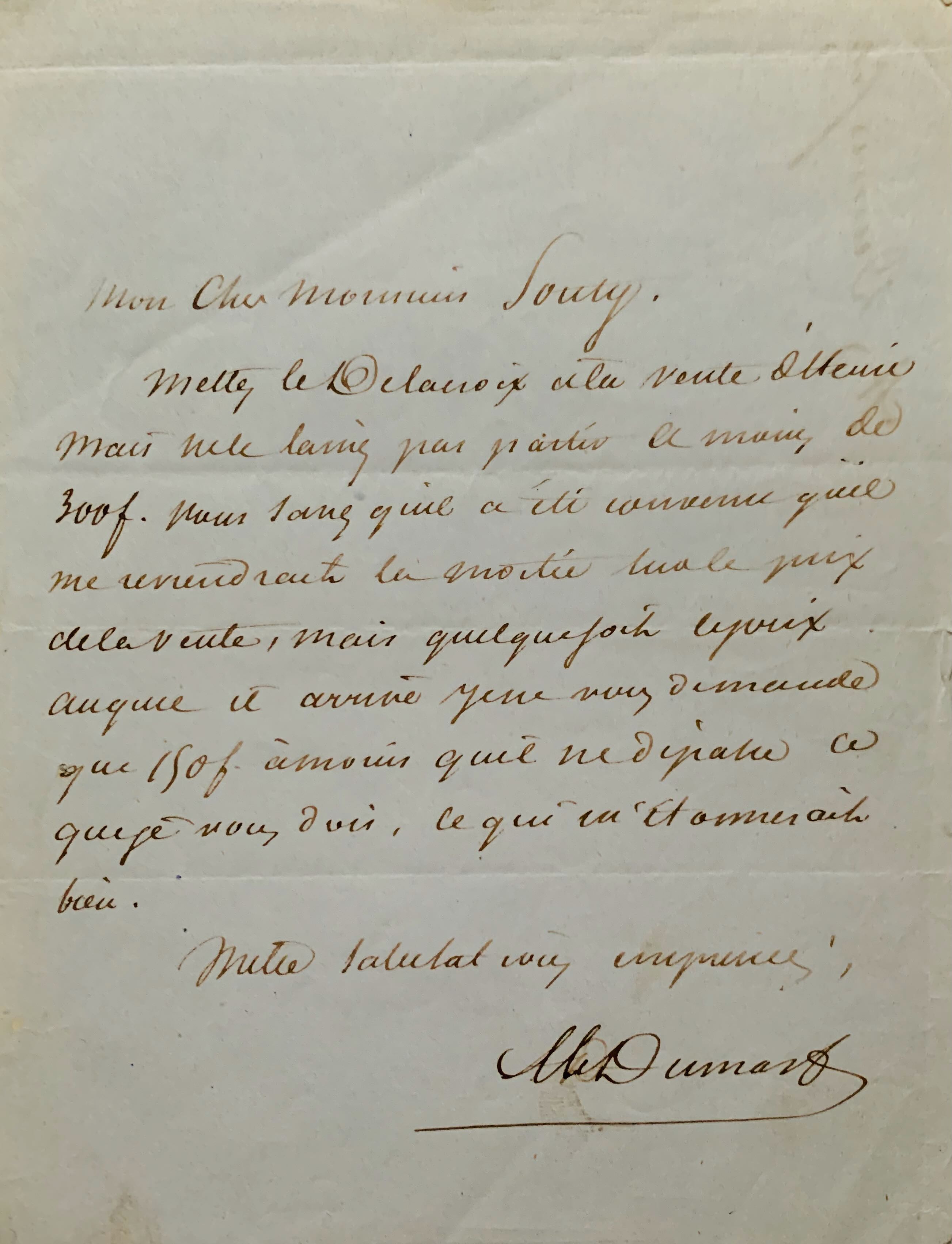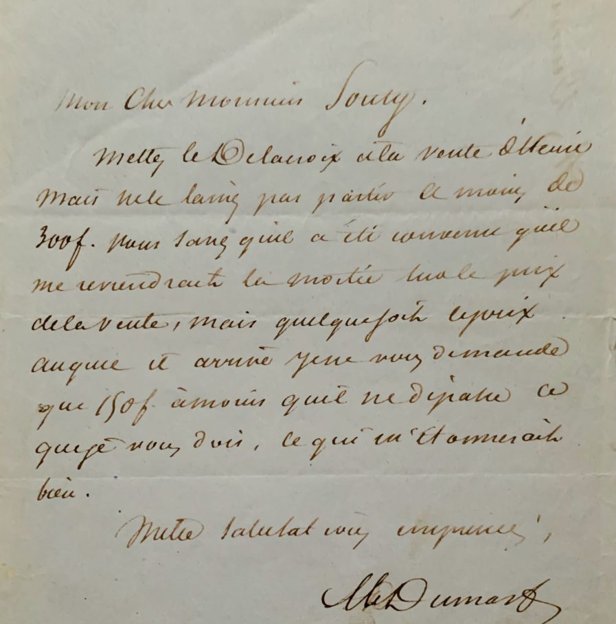 "Mettez le Delacroix à la vente d'Henri mais ne le laissez pas partir à moins de 300 f. Vous savez qu'il a été convenu qu'il me reviendrait la moitié du prix de la vente, mais quelque soit le prix auquel il arrive, je ne vous demande que 150 f. à moins qu'il ne dépasse ce que je vous dois, ce qui m'étonnerait bien".
