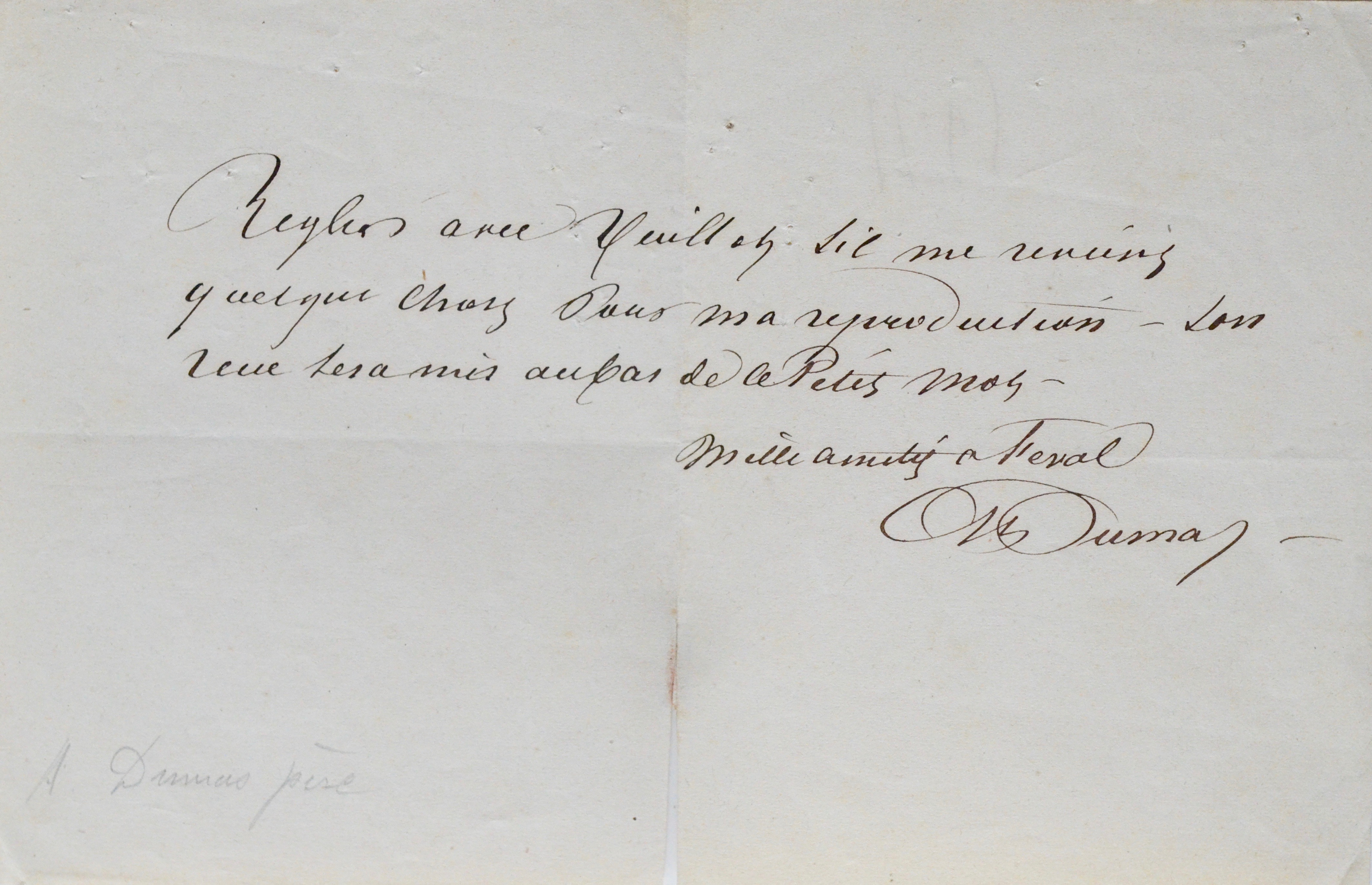 Billet autographe signé d'Alexandre Dumas père, dans lequel il évoque l'écrivain Paul Féval (