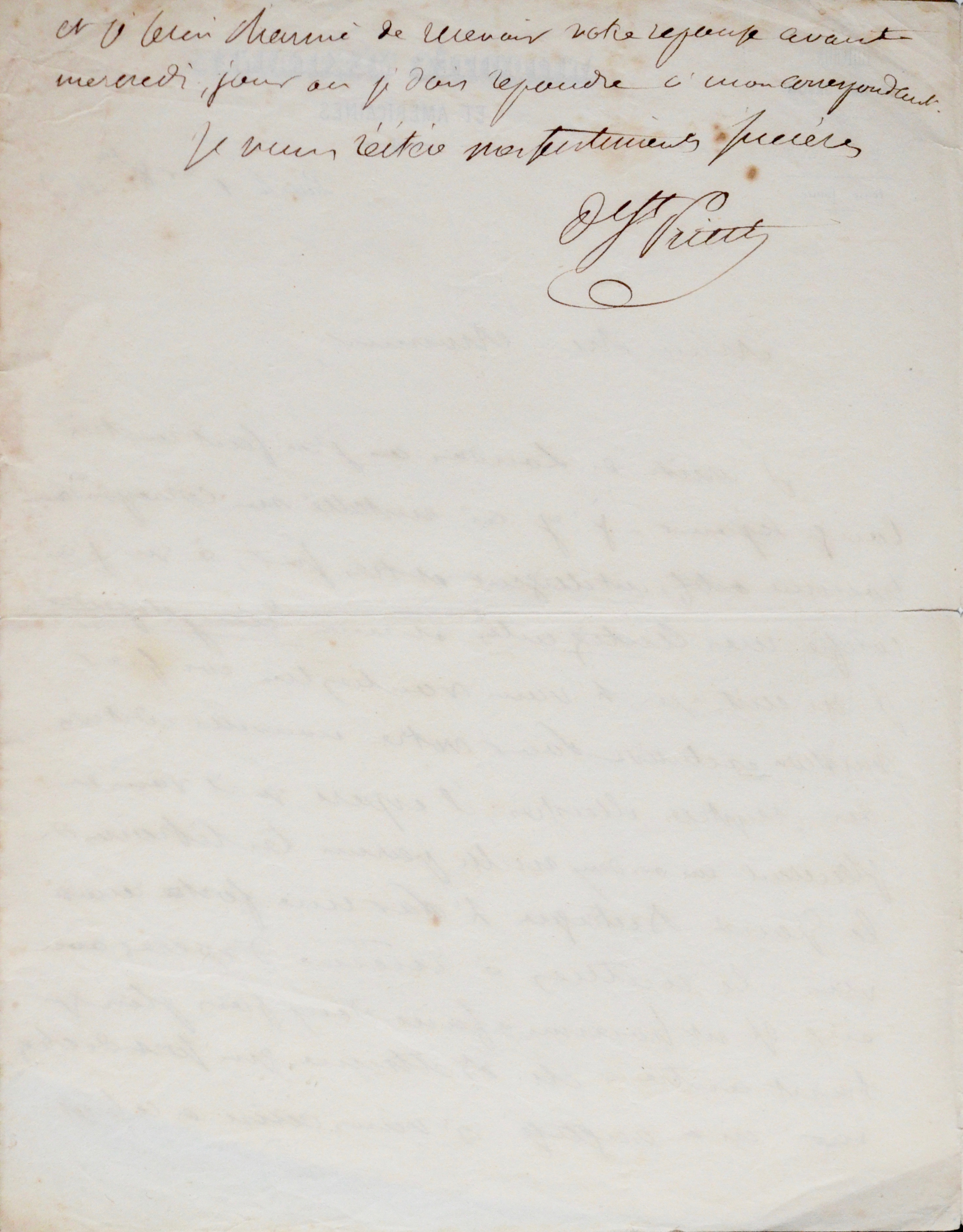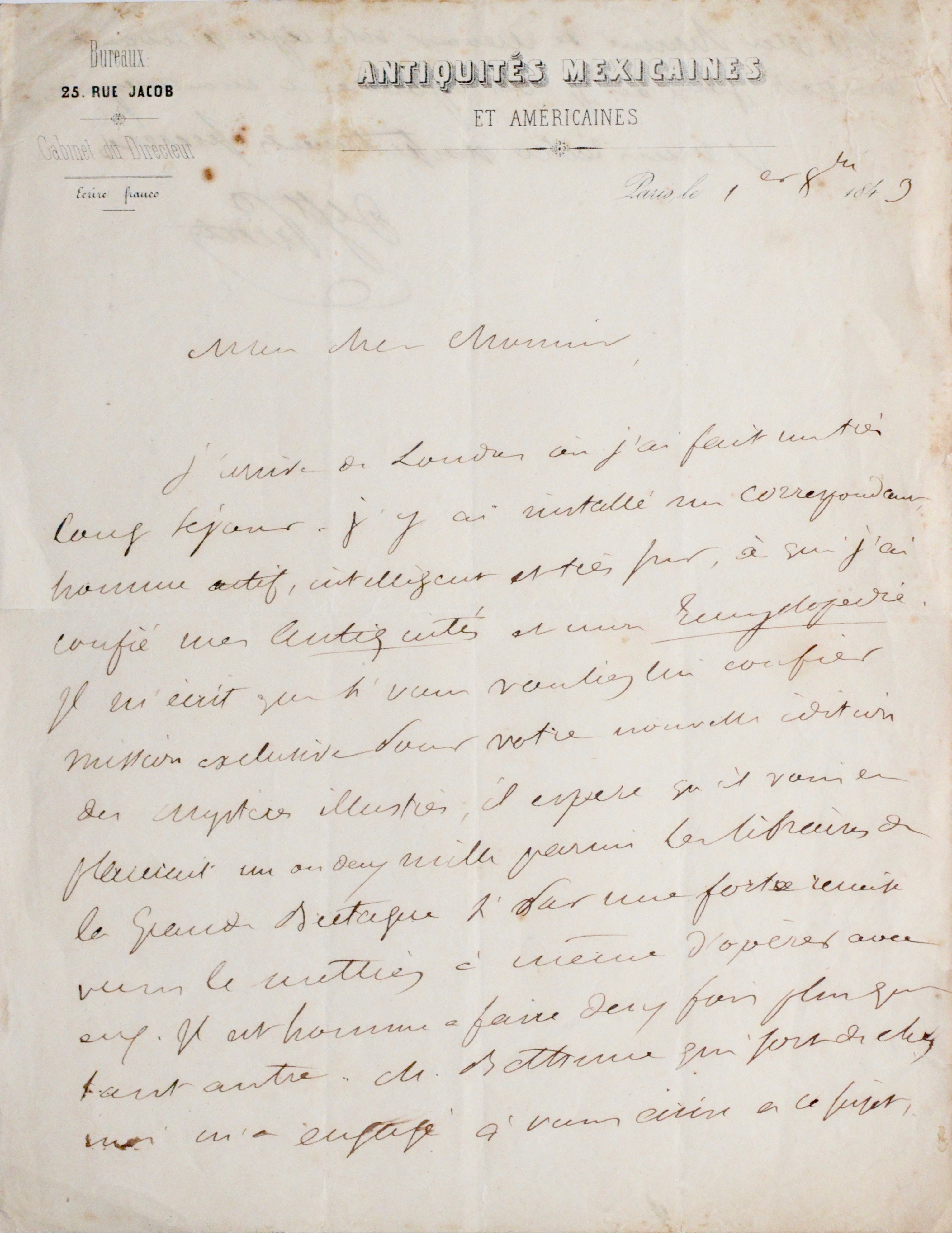 Encre brune sur double feuillet de papier à en-tête imprimé « Antiquités mexicaines et américaines », « cabinet du directeur ». Adresse et marques postales au verso du second feuillet.
