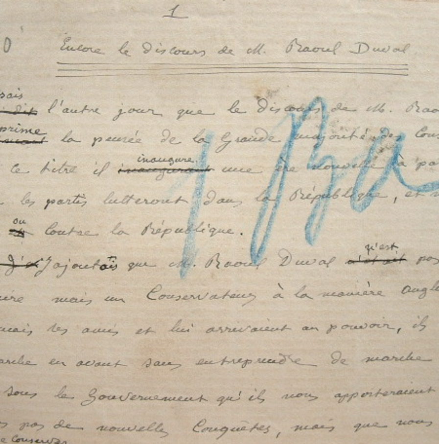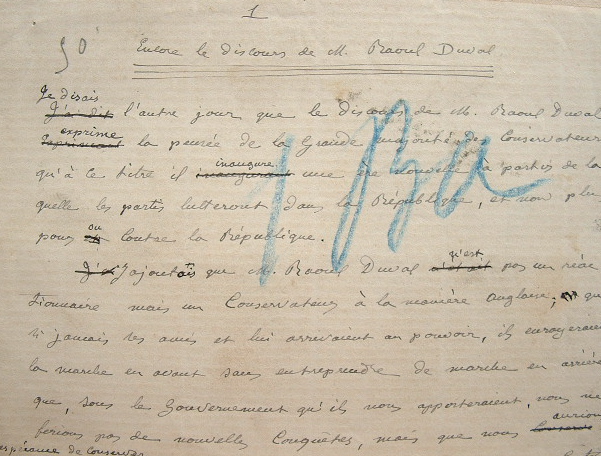 Manuscrit découpé pour l'impression, avec ratures et corrections, intitulé : «Encore le discours de M. Raoul Duval», dans lequel il critique sans détours le conservateur Duval (1807/1893). «M. Raoul Duval n'est pas un réactionnaire mais un conservateur à la manière anglaise. Si jamais ses amis et lui arrivaient au pouvoir, ils enrayeraient la marche en avant sans entreprendre de marche en arrière [...]».