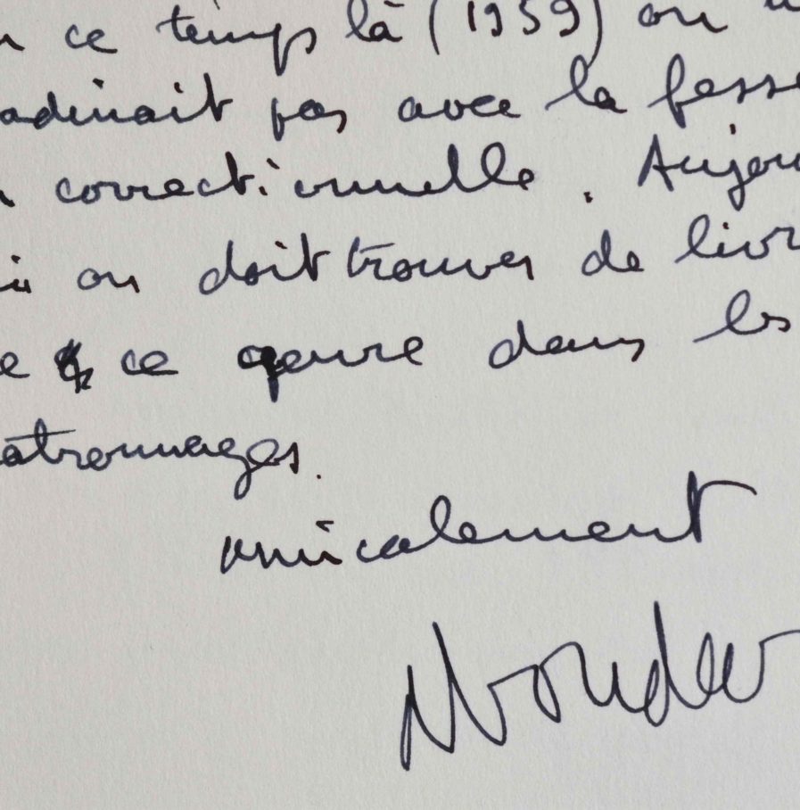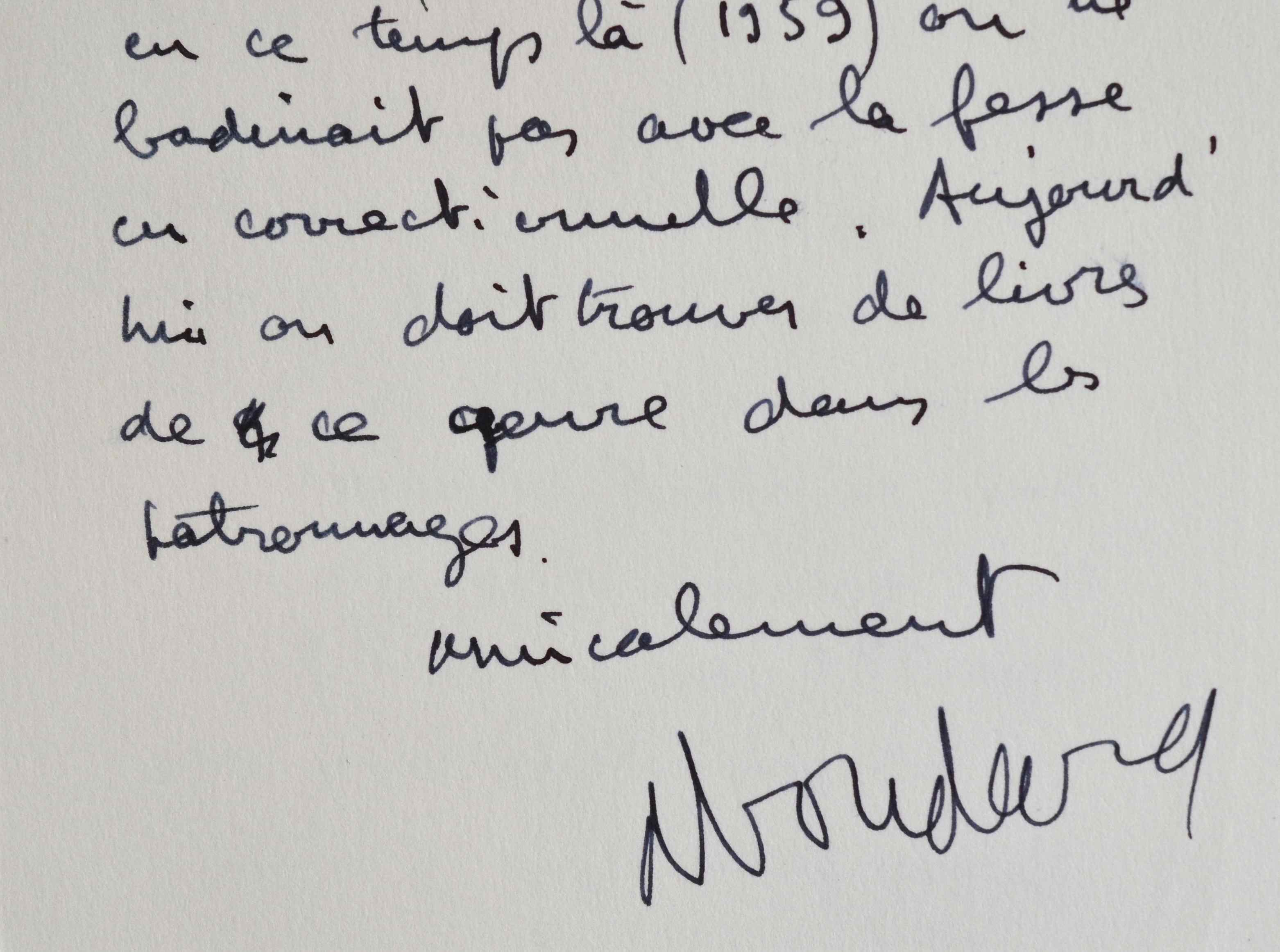 Alphonse Boudard (Paris, 1925/2000)Intéressante lettre d'Alphonse Boudard au sujet du pseudonyme qu'il utilisa pour l'écriture de son roman érotique, Les Grandes ardeurs, publié en 1958, et qui lui valut un supplément de prison. «Concernant les pseudos, je ne les révèlent [sic] pas tout simplement parce que je ne veux pas que les textes en question soient dans ma bibliographie. Il y a un large extrait de l'un d'eux dans "Ma vie pleine de trous" publié par Plon en 1988. C'est un livre que Daniel Costelle a écrit d'après une série à la télé qui m'était consacrée : "quel roman que ma vie" sur TF1 en janvier 88. J'ai pris deux mois secs parce que j'étais déjà en taule à ce moment là pour des motifs beaucoup plus graves. Donc je ne pouvais pas bénéficier de sursis. De toutes façons il n'y avait pas de quoi fouetter un chat (le cas de le dire). Mais en ce temps là (1959) on ne badinait pas avec la fesse en correctionnelle. Aujourd'hui on doit trouver des livres de ce genre dans les patronages».
