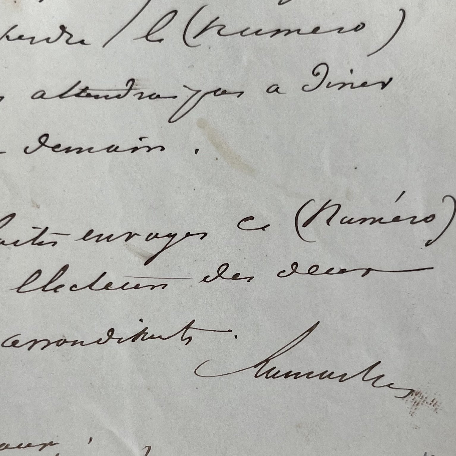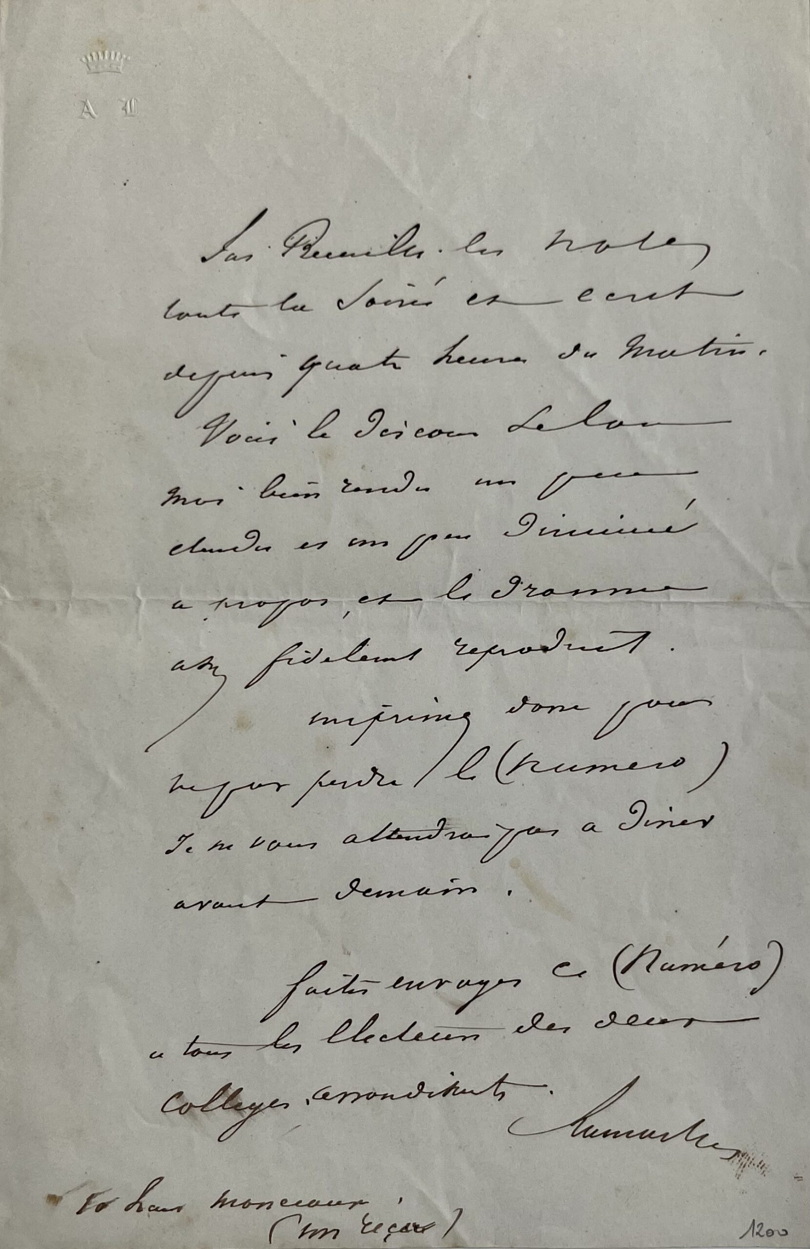 "J'ai recueilli les notes toute la soirée et écrit depuis quatre heures du matin. Voici le discours selon moi bien rendu un peu étendu et un peu diminué à propos, et le (drame ?) assez fidèlement reproduit. Imprimez donc pour ne pas perdre le (Numero). Je ne vous attendrai pas à diner avant demain. Faites envoyer ce (Numero) a tous les électeurs des deux collèges arrondissants. Lamartine". Il ajoute "10 heures Monceaux. (Un reçu )".