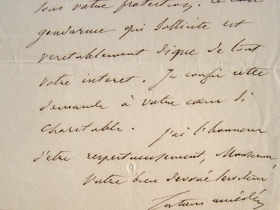 Il adresse une demande au directeur de l'assistance publique. "Je serais bien heureux que vous voulussiez bien le prendre sous votre protection. Le bon gendarme qui sollicite est véritablement digne de tout votre intérêt. Je confie cette demande à votre coeur si charitable [...]".