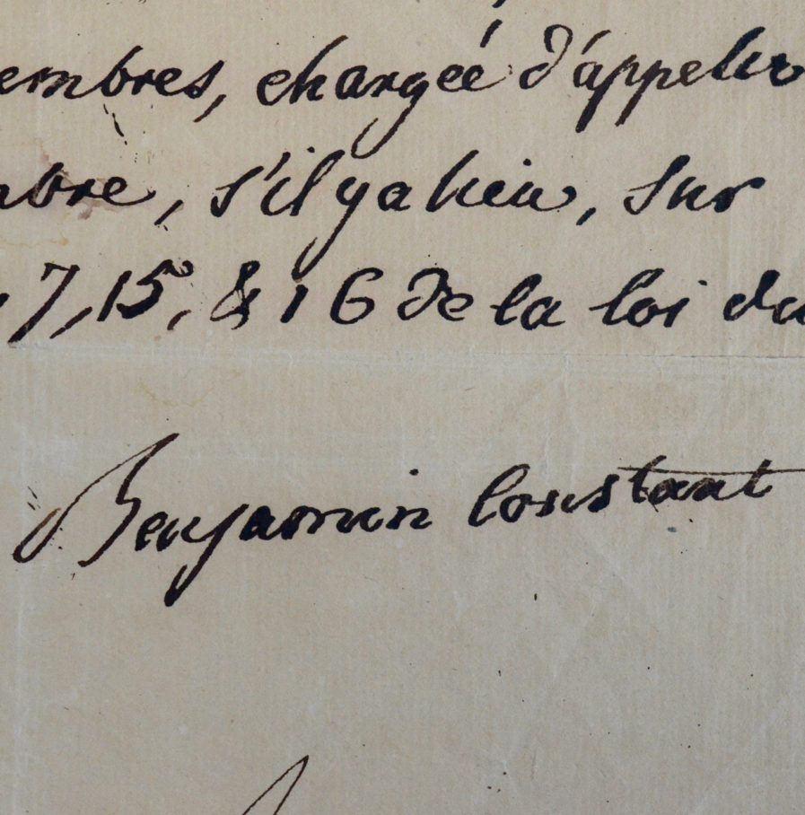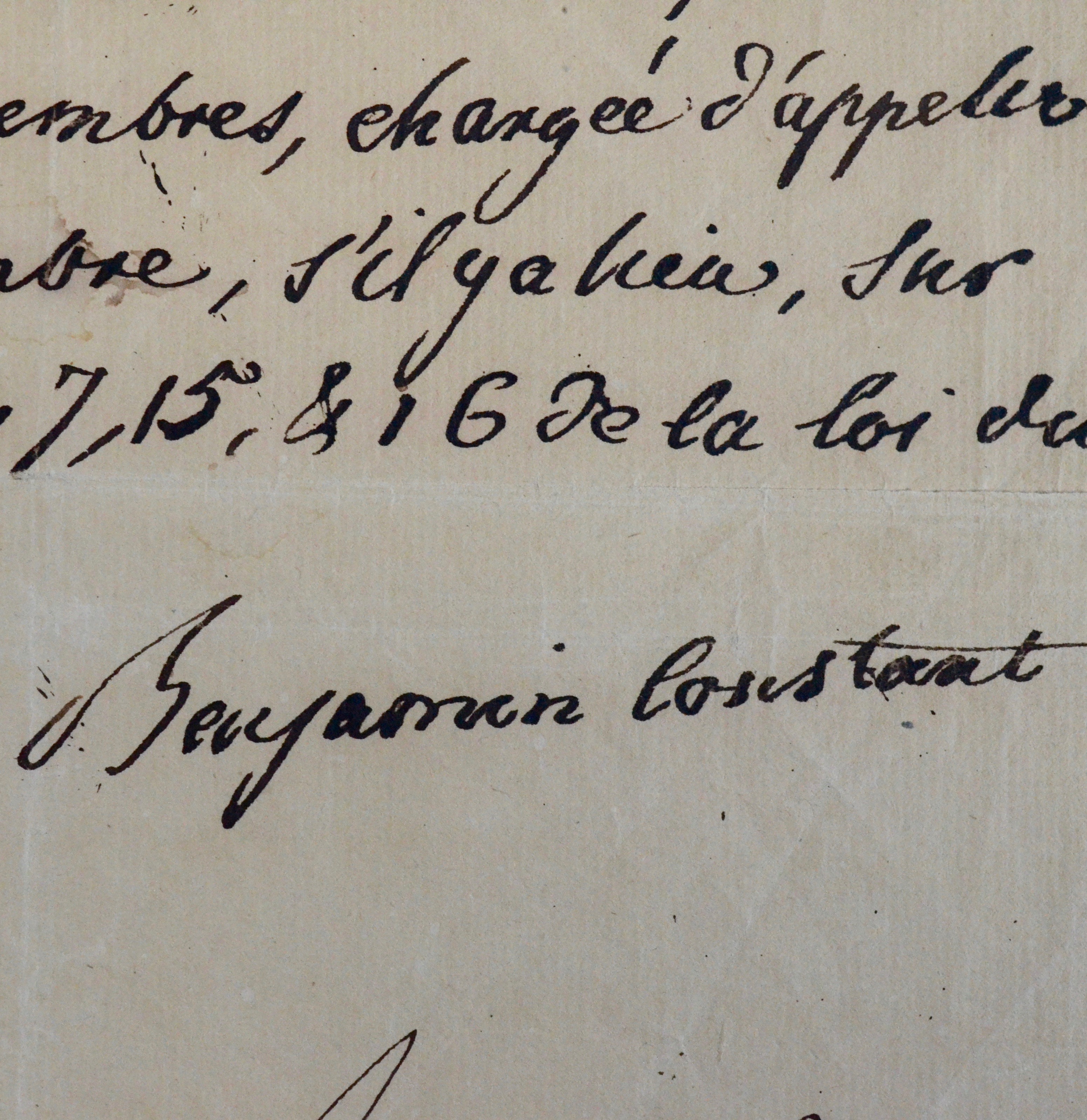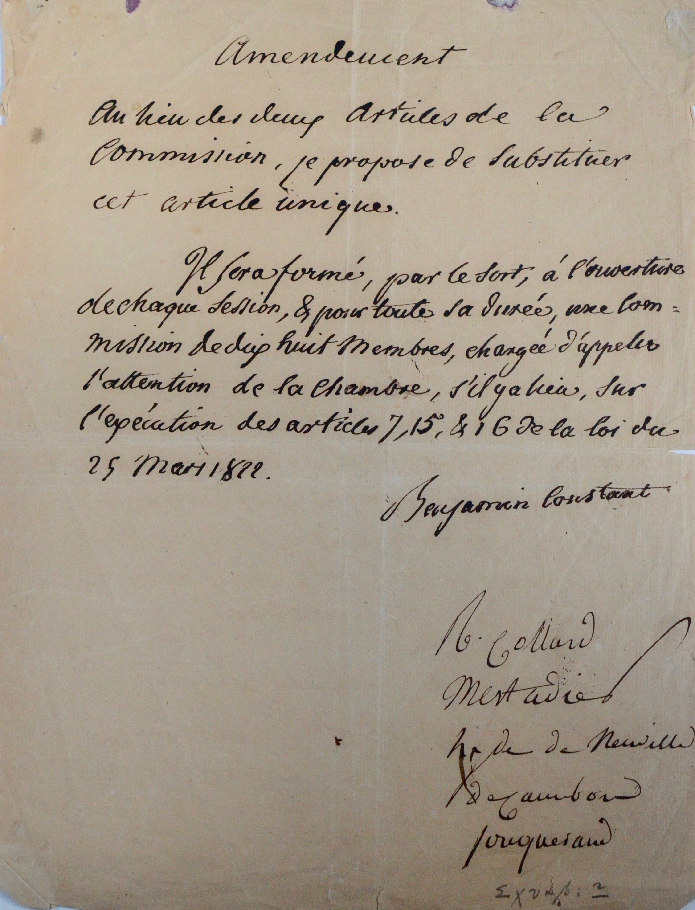 Benjamin Constant de Rebecque (Lausanne, 1767/1830)Précieux amendement rédigé par Benjamin Constant relatif à la répression et la poursuite des délits commis par la loi du 31 mars 1820, article instaurant une censure (qui sera abrogée en 1830).