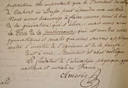 Francisco Amoros (Valence, 1770/1848)"Comme membre de la Société pour l'instruction élémentaire et comme député, vous devez protéger tout ce qui peut intéresser l'éducation de la jeunesse". François Amoros, qui implanta la gymnastique en France, s'indique du projet de suppression de l'allocation pour l'entretien du Gymnase normal et l'établissement d'autres gymnases. "Mais le député Baron de Mornay qui demande une augmentation de 40.000 frs pour construire une classe, persiste toujours dans l'idée heureuse de soutenir cet amendement et de prouver l'importance du Gymnase normal qui est militaire et civil en même temps, et qui reçoit gratuitement tous les élèves pauvres des Ecoles mutuelles ou autres qui se présentent pour prendre part à ses exercices". Il lui demande d'agir envers ses collègues députés, et ajoute : "Avant de partir pour établir les Gymnases divisionnaires, je rendrai compte à notre société d'une proposition très importante que le proviseur du collège de Cahors m'adresse pour répandre ma méthode. Nous avons beaucoup à faire encore pour le bien de la génération qui s'élève ; mais nous avons la Force de la persévérance, qui est une des vertus gymnastiques et sociales que nous saurons appliquer contre l'inertie de l'égoïsme et de la paresse". Il fait précéder sa signature de ce titre : "Le fondateur de l'éducation physique, gymnastique et morale en France".