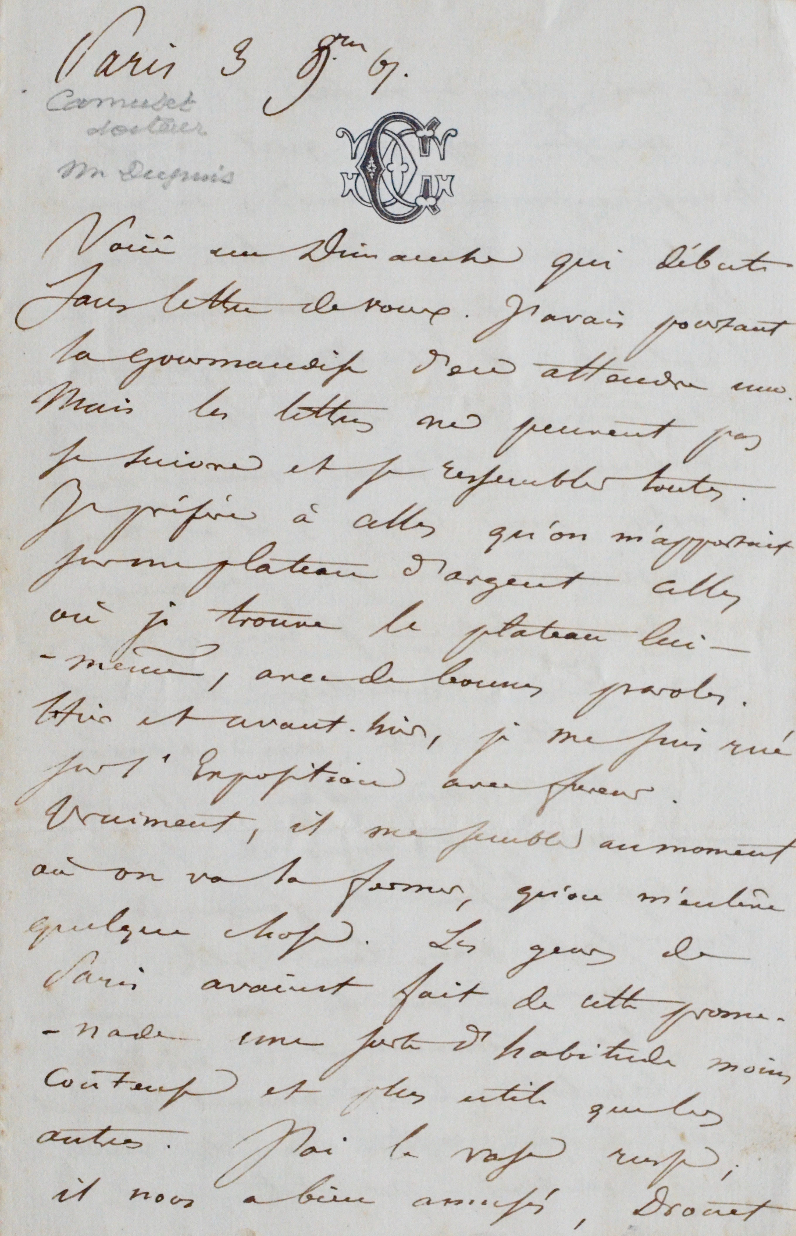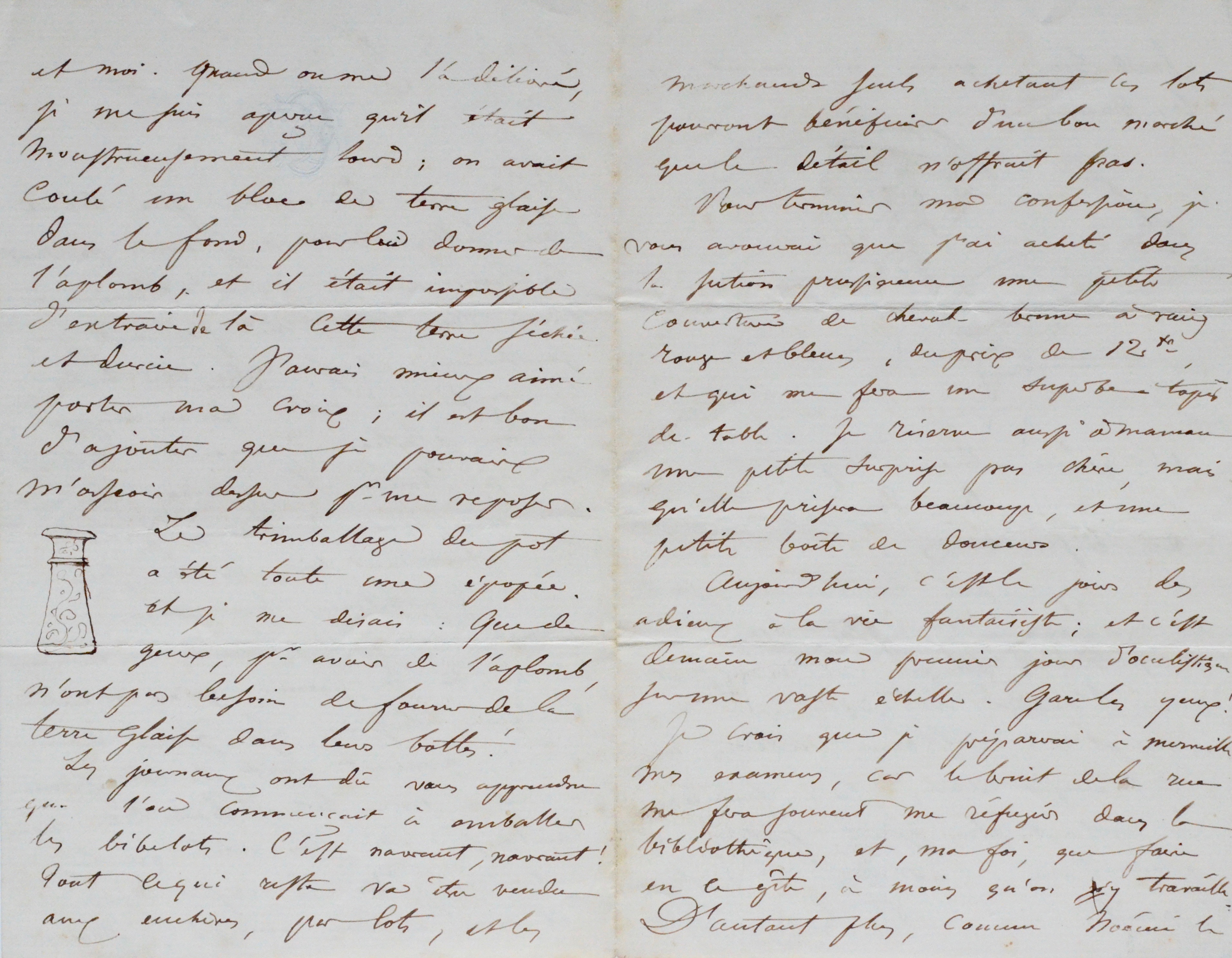 Il va vraisemblablement vendre des biens aux enchères, il évoque une exposition, son ami Drouet, un vase "monstrueusement lourd" avec un fond en glaise "Le trimballage du pot a été toute une épopée [...]" [Camuset a dessiné ledit vase] et ajoute "Les journaux ont dû vous apprendre que l'on commençait à emballer les bibelots. C'est navrant, navrant ! Tout ce qui reste va être vendu aux enchères, par lot, et les marchands seuls achetant ces lots pourront bénéficier d'un bon marché que le détail n'offrait pas [...]. Il a acheté une couverture de cheval pour en faire un tapis de table, "je réserve aussi à maman une petite surprise pas chère [...]. Aujourd'hui, c'est le jour des adieux à la vie fantaisie ; et c'est demain mon premier jour d'oculistique. [...] Je crois que je préparerai à merveille mes examens, car le bruit de la rue me fera souvent me réfugier dans la bibliothèque, et, ma foi, que faire en ce gîte, à moins qu'on y travaille. D'autant plus, comme Noémie le sait bien, qu'on n'y reçoit pas les dames [dessin à la plume représentant une femme laide, à lunette, coiffée d'un chapeau, lisant un livre sur un pupitre] et qu'on a bien raison, car.... nous leur donnerions trop de distraction. Je suis terriblement seul en ce moment [...].