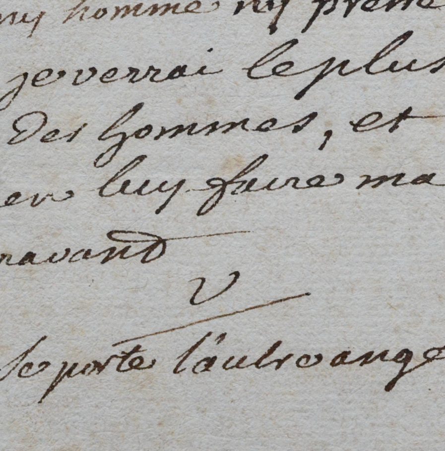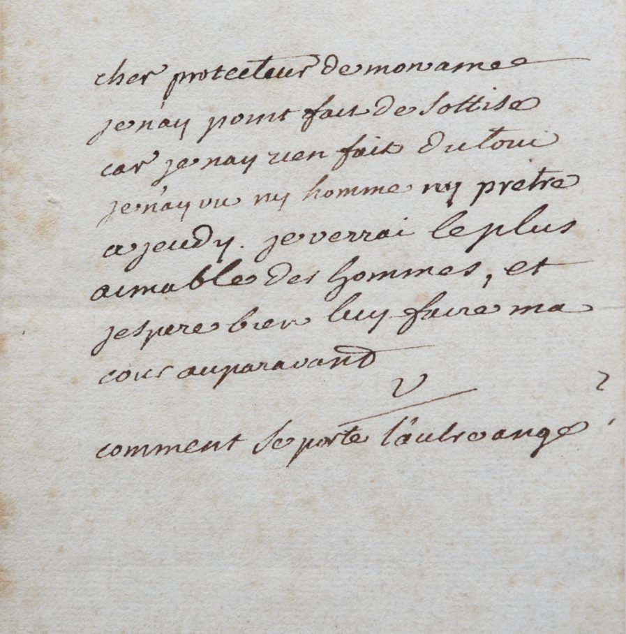 "Cher protecteur de mon âme je n'ay point fait de sottise car je n'ay rien fait du tout. Je n'ay vu ny homme ny pretre. A Jeudy. Je verrai le plus aimable des hommes, et j'espère bien lui faire ma cour auparavant. [...] Comment se porte l'autre ange ?".