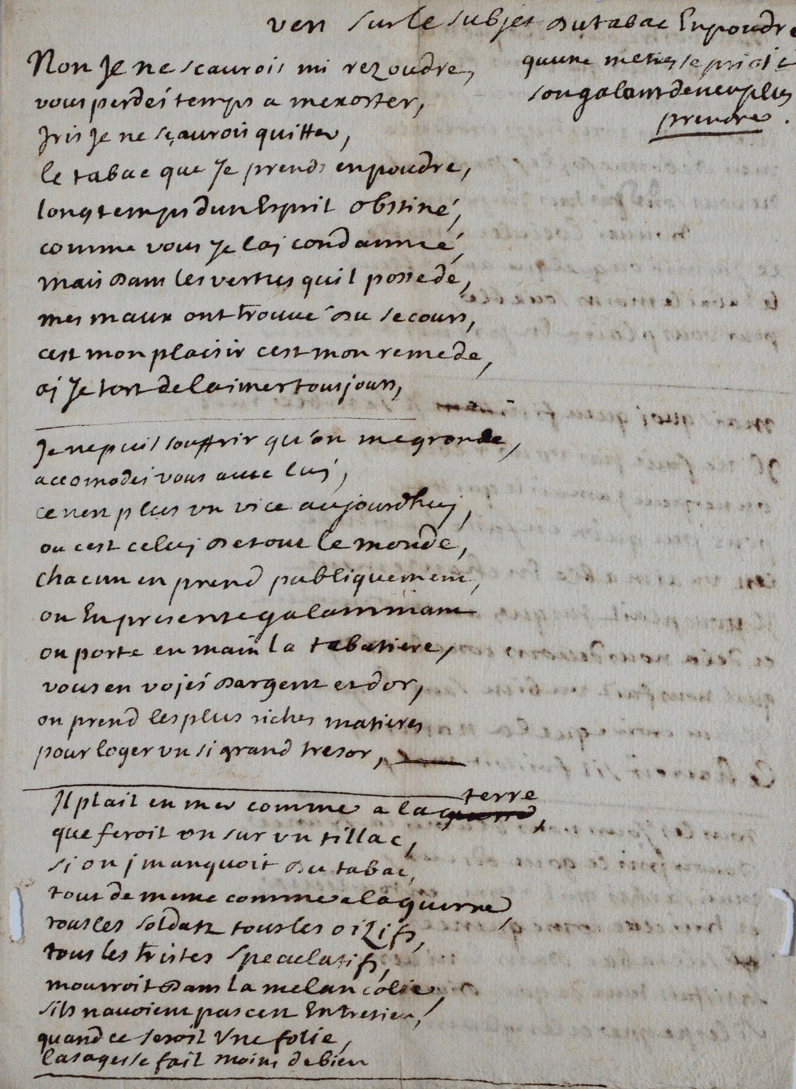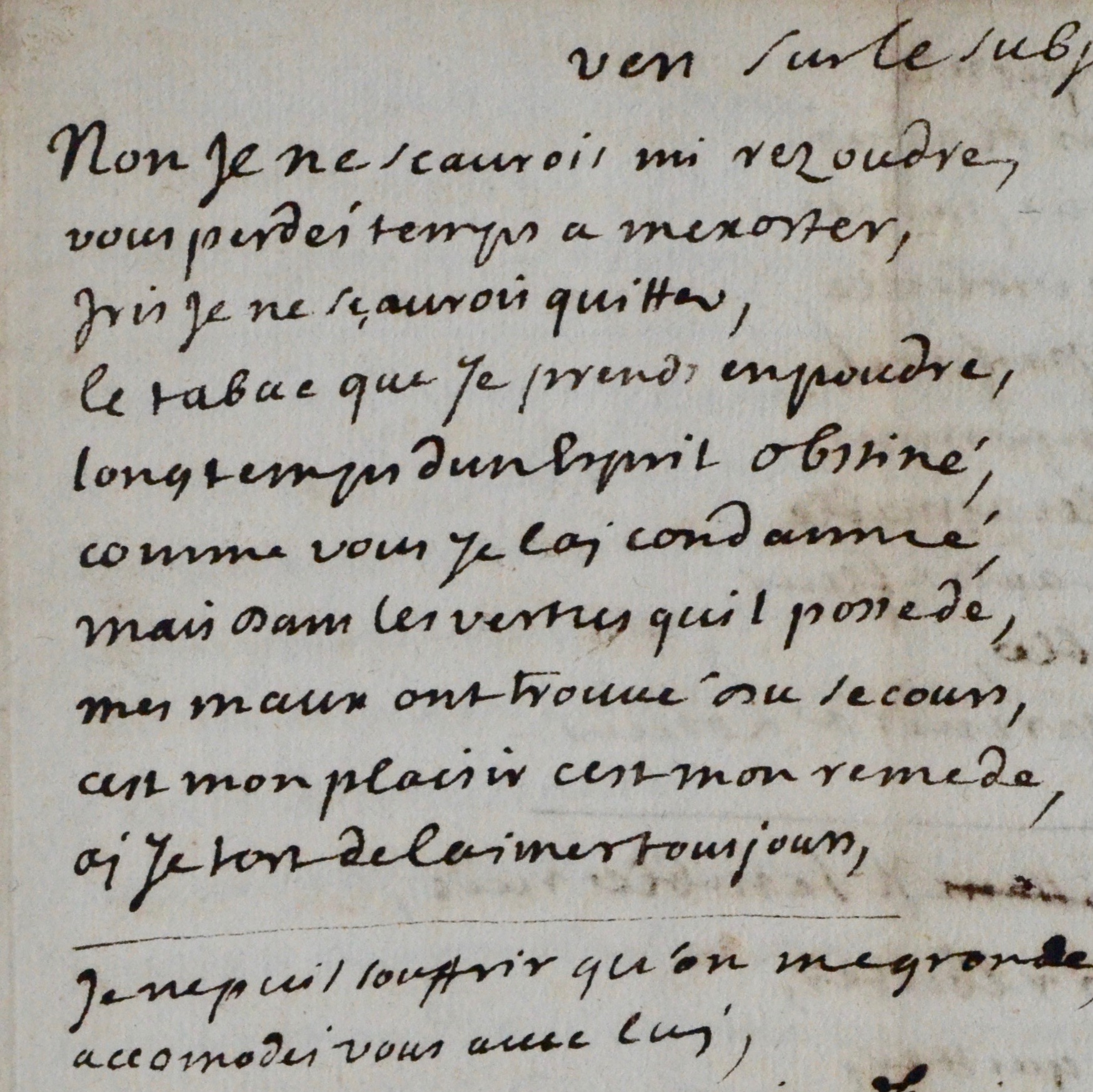 "Non je ne scaurois me rezoudre / vous perdès temps à m'exorter / Iris je ne sçaurois quitter, / le tabac que je prends en poudre, / longtemps d'un esprit obstiné, / comme vous je l'ai condamné, / mais dans les vertus qu'il possède, / mes maux ont trouvé du secours, / c'est mon plaisir c'est mon remède, / ai-je tort de l'aimer toujours [...]".