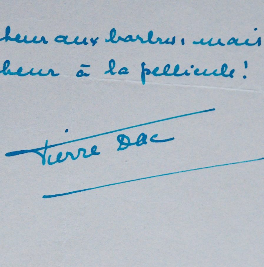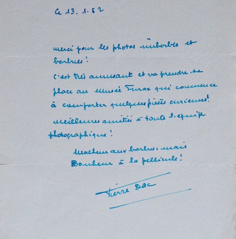 "Merci pour les photos imberbes et barbues ! C'est très amusant et va prendre ta place au musée Furax qui commence à comporter quelques pièces curieuses ! Meilleures amitiés à toute l'équipe photographique ! Malheur aux barbues mais Bonheur à la pellicule !".