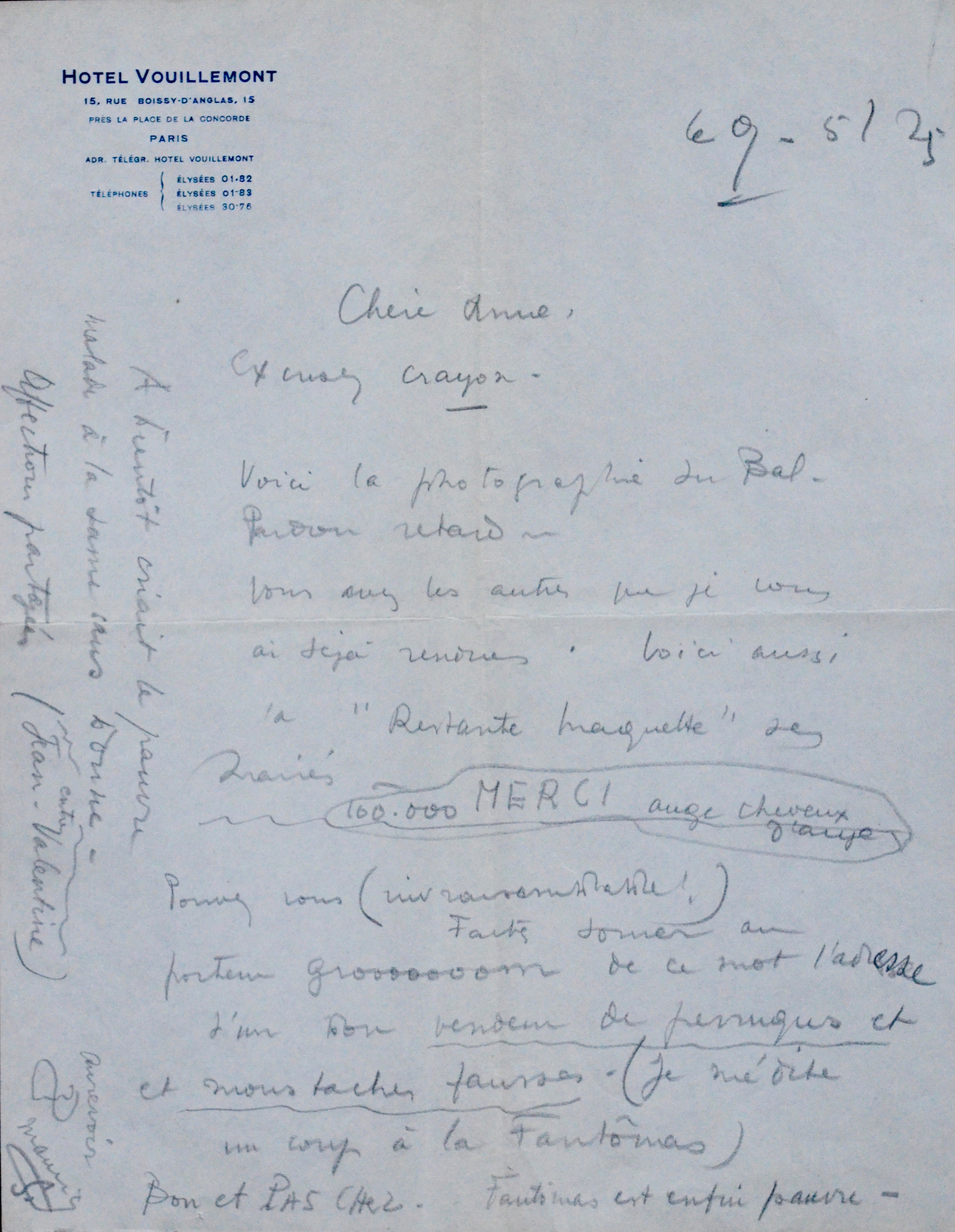 Excentrique courrier de Maurice Sachs, rédigé en style télégraphique : "Excusez crayon. Voici la photographie du Bal. Pardon Retard. Vous avez les autres que je vous ai déjà rendues. Voici aussi la "Restante maquette" [...] 100.000 MERCI". Il ajoute "Faites donner au porteur grooooooooom de ce mot l'adresse d'un bon vendeur de perruques et moustaches fausses (je médite un coup à la Fantômas). Bon et pas cher. Fantômas est enfin pauvre [...]. Affections partagées (entre Jean - Valentine)". Signée "Maurice S."