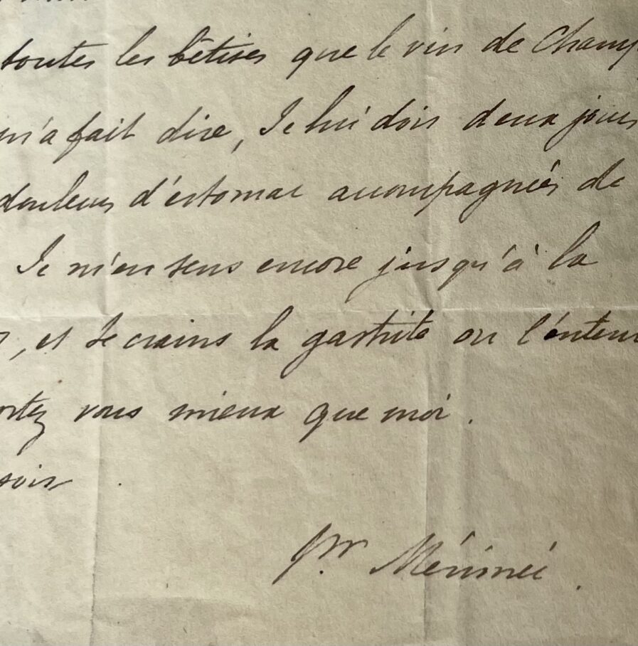 Outre toutes les bêtises que le vin de champagne de David [d'Angers] m'a fait dire, je lui dois deux jours d'horribles douleurs d'estomac accompagnées de migraine. Je m'en sens encore jusqu'à la moelle des os, et je crains la gastrite ou l'entérite. Adieu, portez-vous mieux que moi".