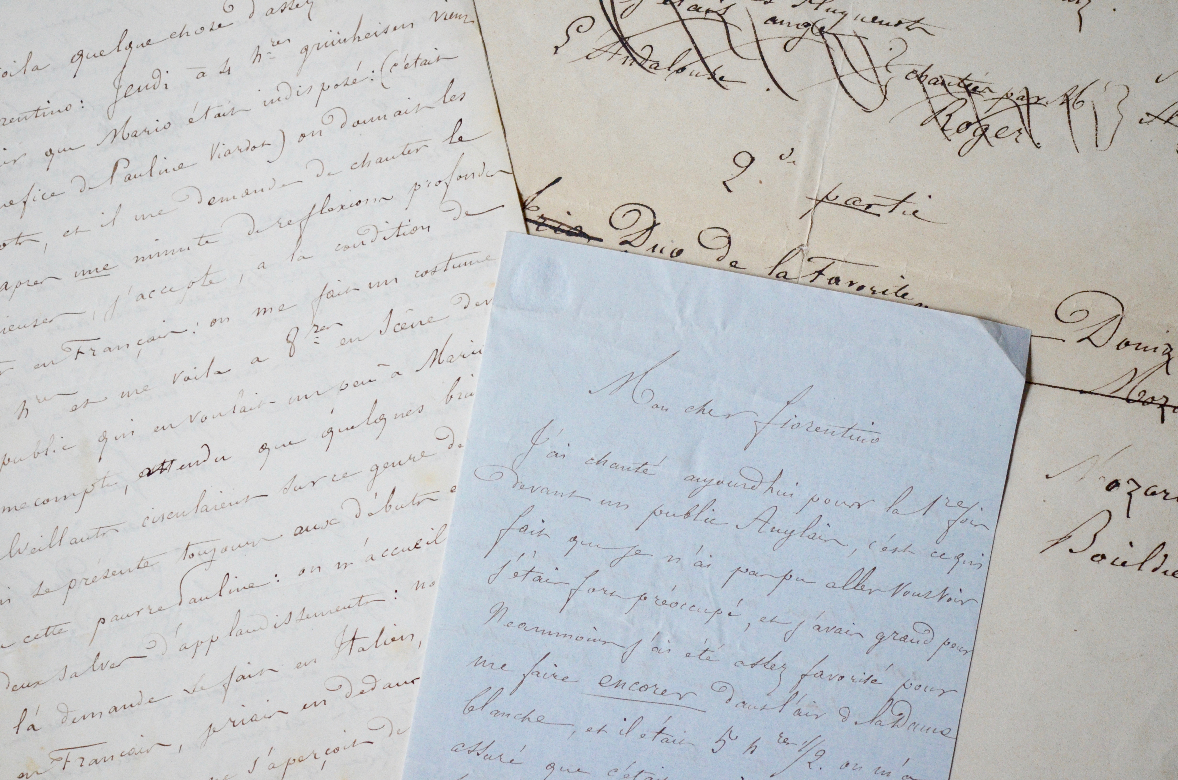 -"Mon cher Fiorentino. J'ai chanté pour le première fois devant un public anglais, c'est ce qui fait que je n'ai pas pu aller vous voir j'étais fort préoccupé, et j'avais grand peur. Néanmoins j'ai été assez favorisé pour me faire encore? dans l'air de la Dame blanche, et il était un immense succès, surtout quand il n'y a que des dames [...]". Il lui écrira plus tard pour le tenir "au courant du passé qui est curieux, du présent, et de l'avenir. J'ai appris aujourd'hui, d'une manière certaine que Duponchel et Roqueplan sont directeurs de l'Opéra. Bien du plaisir à Paris ! moi je dis adieu aux opéras Français et je vais tacher de rester à Golconde : si je fais fortune je bâtirai un phalanstère pour mes amis, et j'enverrai des chevaux gris pommelés aux journalistes bien pensants [...]".