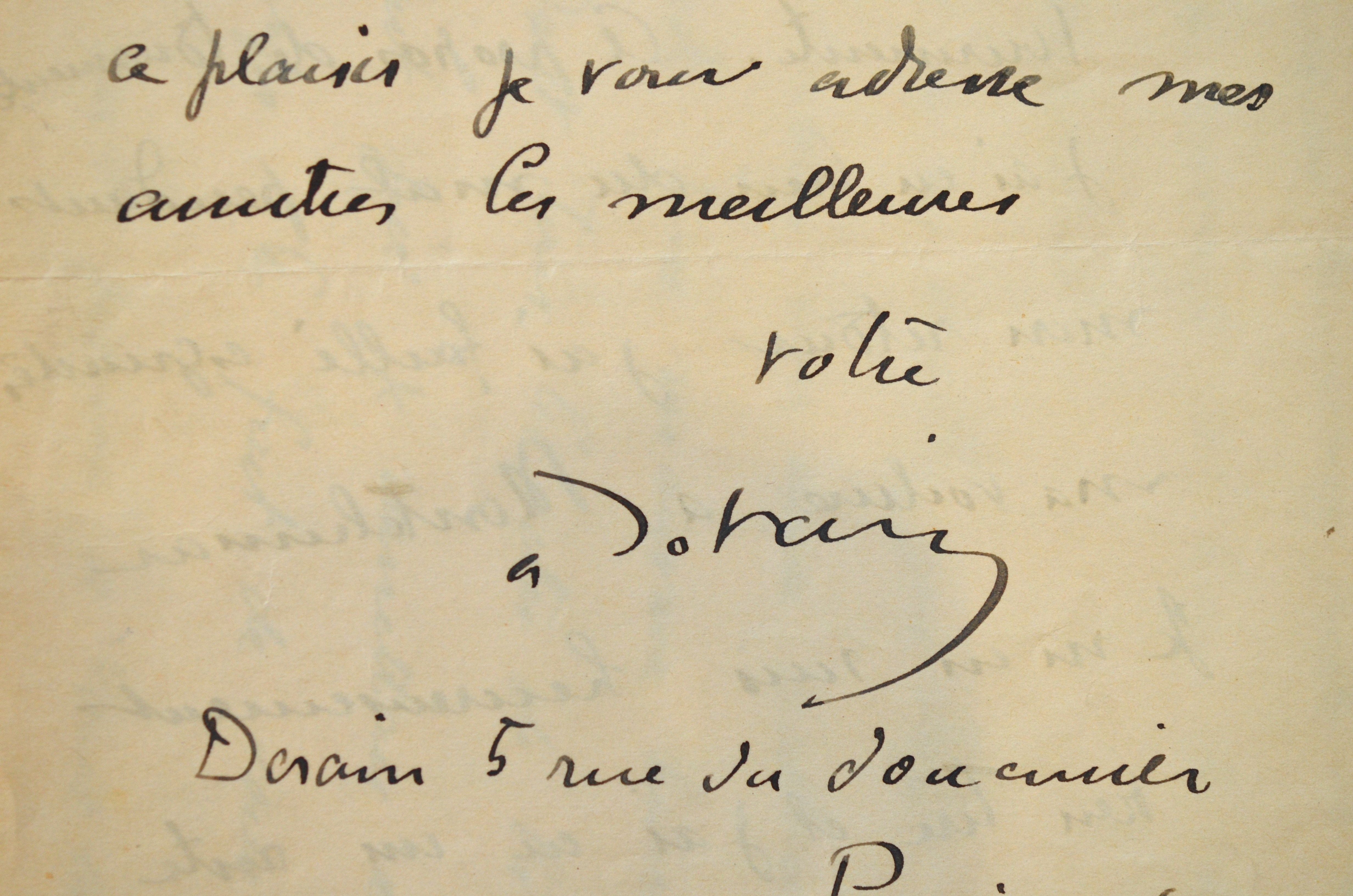 André Derain (Chatou, 1880/1954)Avec un mois d'avance, André Derain adresse ses "meilleurs souhaits" pour Noël. "J'avais pensé retourner une dizaine de jours à St Rémy pour faire quelques aquarelles. Mais je n'ai pu exécuter ce projet, car Paris vous interdit les voyages à cette époque de l'année". Il a transmis ses cartes à Dignimont qui l'en remercie. "J'ai essayé d'apprendre quelques une des chansons mais vraiment ma mémoire est fort éprouvée et il n'y a pas moyen. Paris n'est pas très gai cette année, j'envie votre sagesse de savoir rester dans le Midi et de ne pas être abruti par cette tourmente". Il raconte que, lors de son retour à la capitale, il a failli avoir un accident avec sa voiture. "Nous avons beaucoup parlé de vous avec Galanis qui se souvient fort bien du temps où il vous fréquentait. Ne m'en veuillez pas trop de vous avoir délaissé mais une année particulièrement dure et maussade, une mauvaise humeur généralisée rendant tous les actes de la vie insipides, firent que je remettrai à de meilleurs temps le fait de vous écrire [...]".