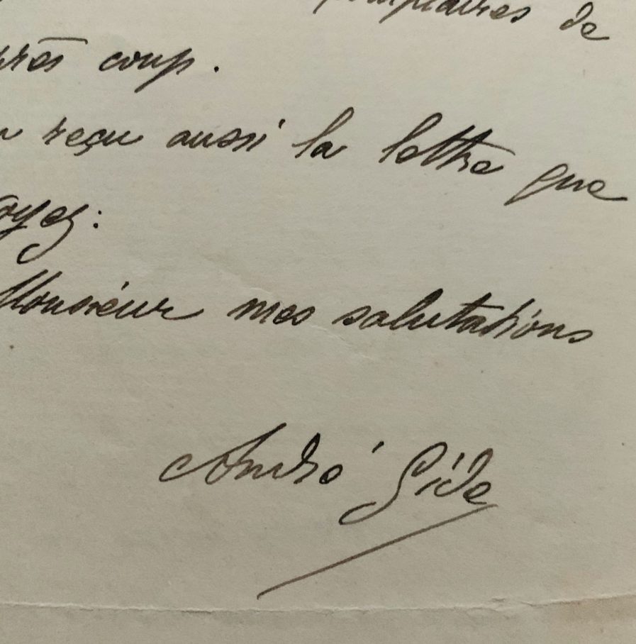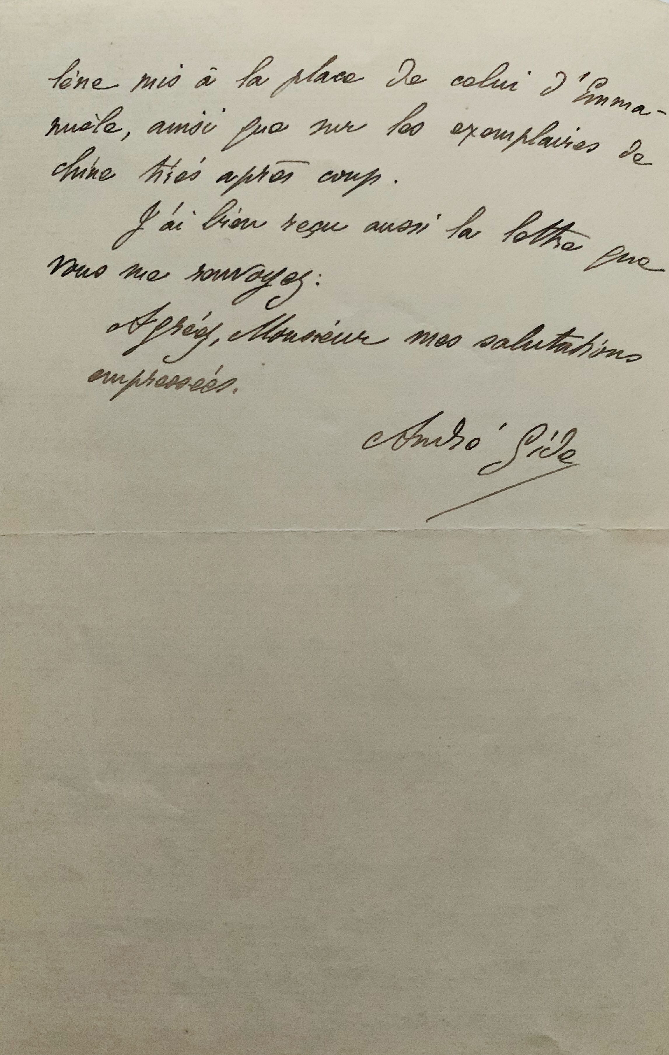 André Gide (Paris, 1869/1951)Lettre d'André Gide à son éditeur au sujet de la seconde émission des Cahiers d'André Walter (1891) pour laquelle Gide fit corriger le nom de Madeleine en Emmanuèle. Le livre fut imprimé à Tours par l'imprimeur Deslis et la couverture à Paris par Capiomont.
