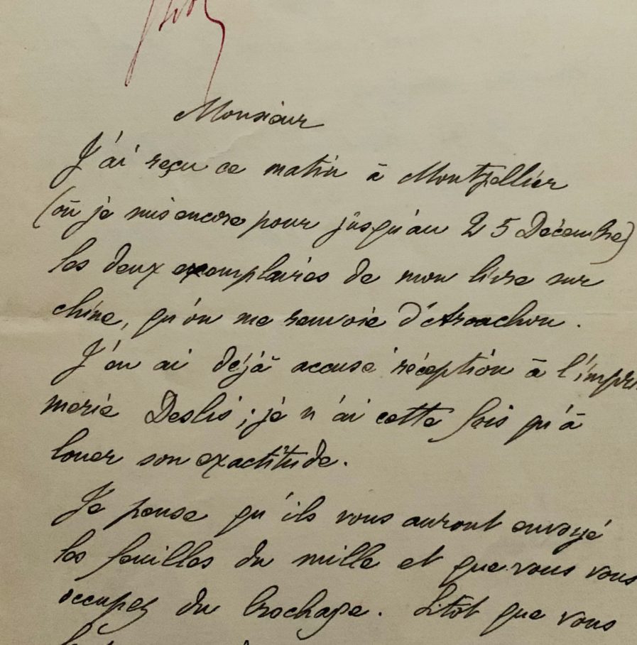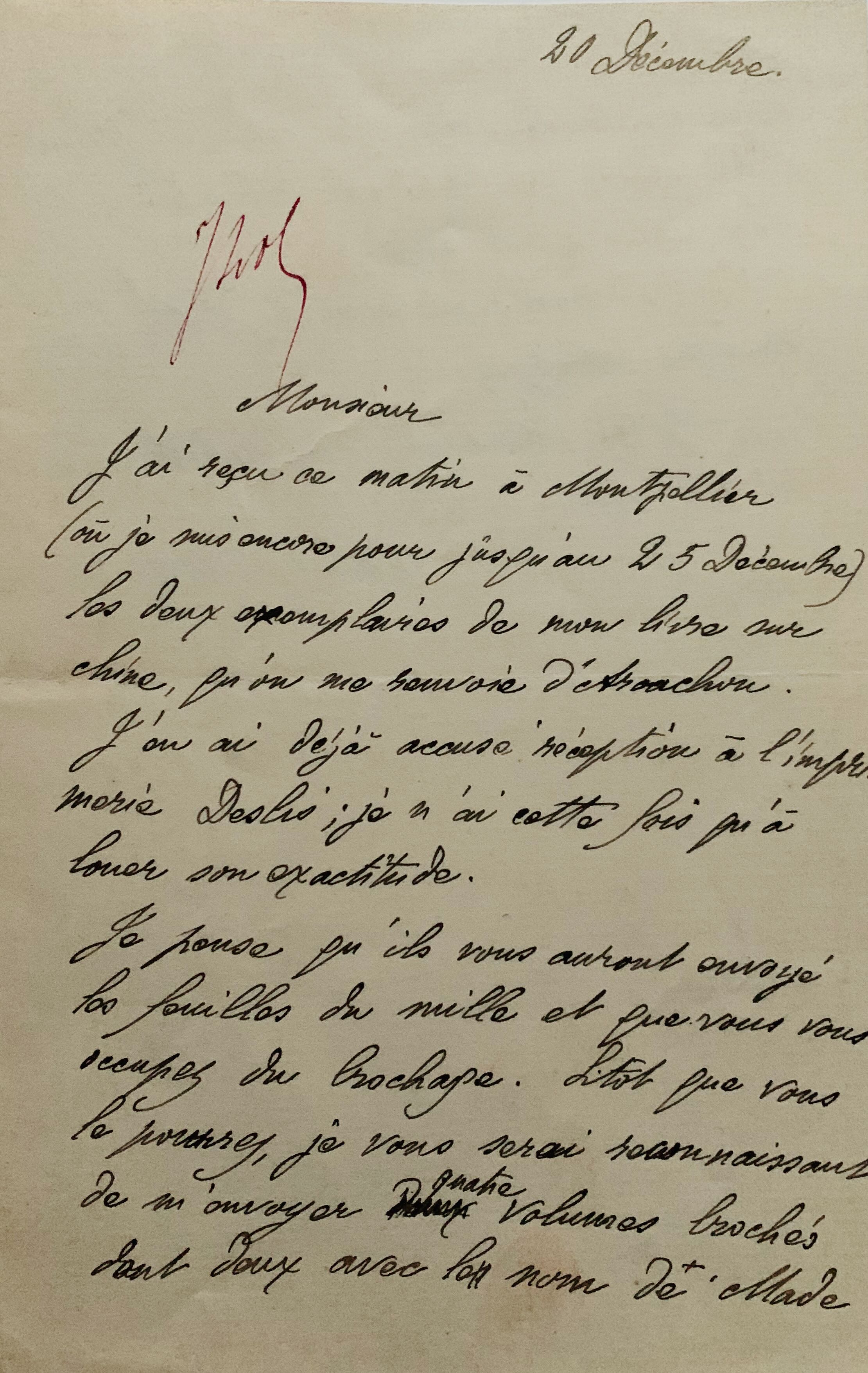 "J'ai reçu ce matin à Montpellier (où je suis encore jusqu'au 25 décembre) les deux exemplaires de mon livre sur chine, qu'on me renvoie d'Arcachon. J'en ai déjà accusé réception à l'imprimeur Desclis ; je n'ai cette fois qu'à louer son exactitude.