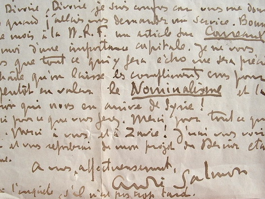 André Salmon (Paris, 1881/1969)André Salmon exprime sa gratitude après l'article élogieux de son correspondant. «Je ne cède rien à la joie que j'ai éprouvée hier soir à lire dans la page des Lettres le Visage qu'a signé Nino Frank [...]. Et l'article, affectueux, était aussi une bien jolie réussite littéraire. Et le dessin a eu tant de succès qu'on vient de me le demander pour l'Amérique !». Il est d'autant plus confus de cet éloge, qu'il allait lui demander un service. «Bonnoure donne ce mois à la N.R.F. un article sur Carreaux [Carreaux. 1918-1921, publié chez Gallimard, en 1928], qui est pour moi d'une importance capitale. Je ne vous cache pas que tout ce qui y fera écho me sera précieux. Je souhaite qu'on laisse les compliments crus pour mettre plutôt en valeur le Nominalisme et la définition qui nous en arrive de Syrie ! [...]». Il pense aller le voir pour lui faire part de son projet de "Dernier état poétique".