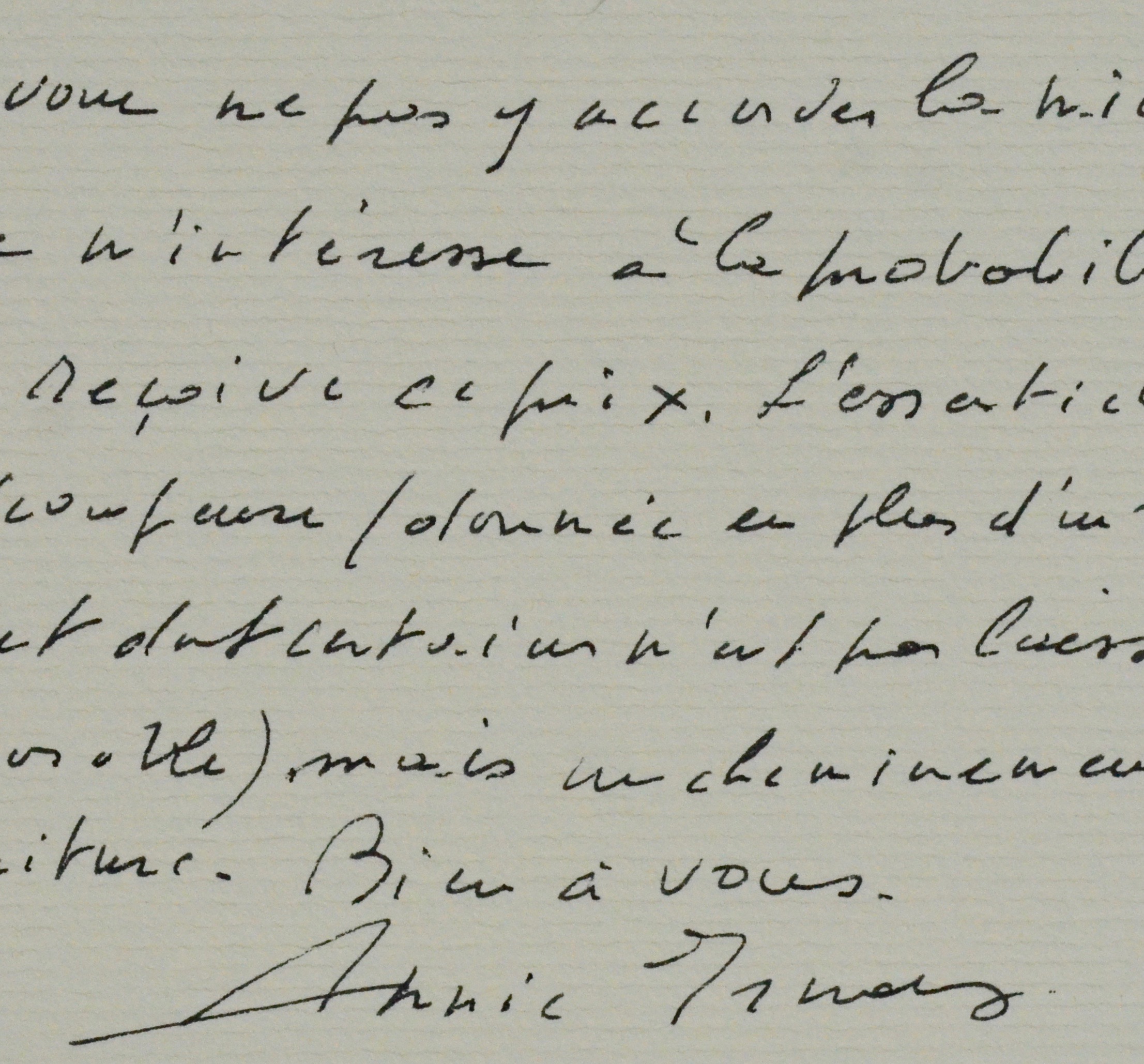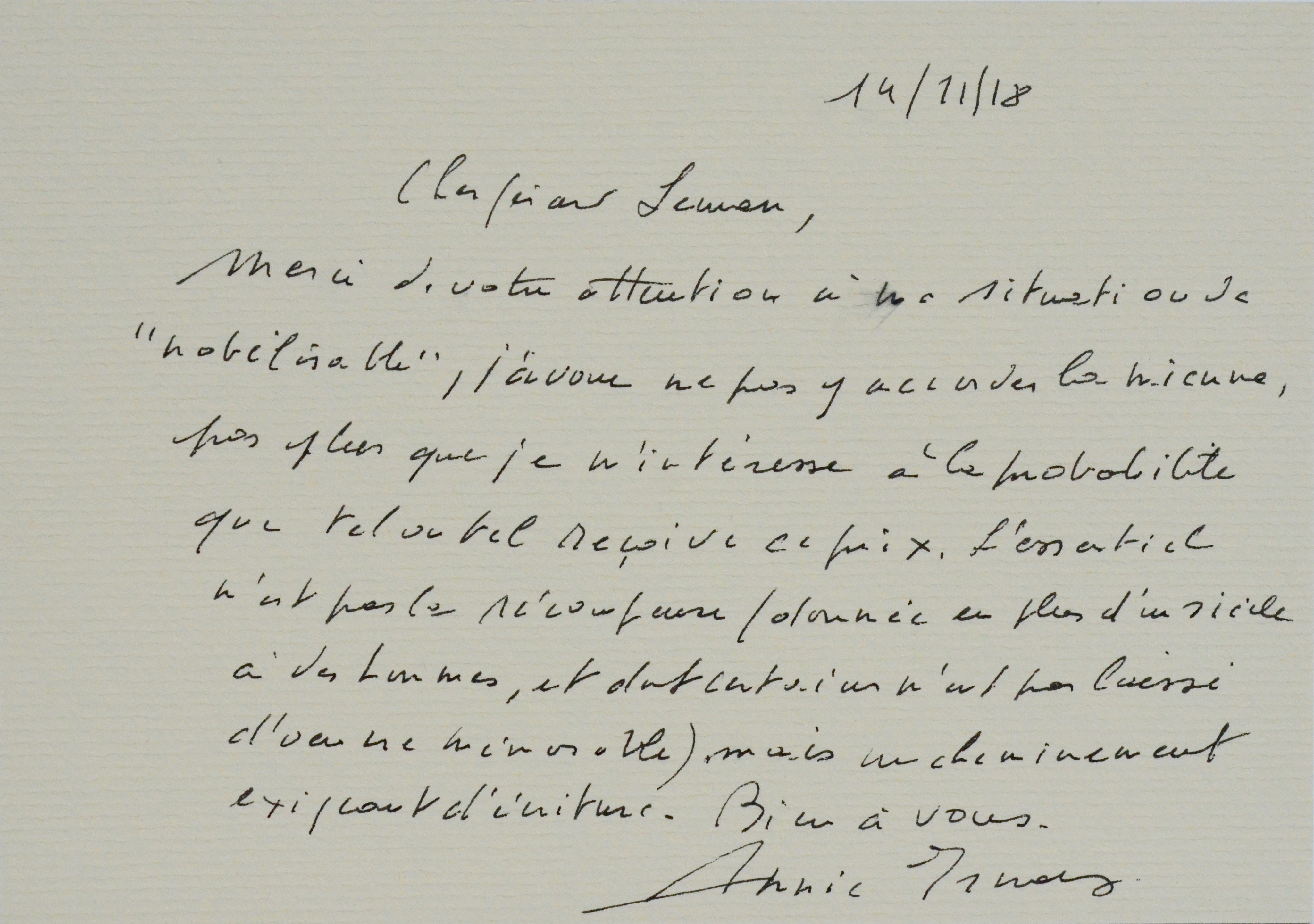 "Merci de votre attention à ma situation de "nobélisable", j'avoue ne pas y accorder la mienne, pas plus que je m'intéresse à la probabilité que tel ou tel reçoive ce prix. L'essentiel n'est pas la récompense (donnée en plus d'un siècle à des hommes, et dont certains n'ont pas laissé d'oeuvre mémorable) mais un cheminement exigeant d'écriture".