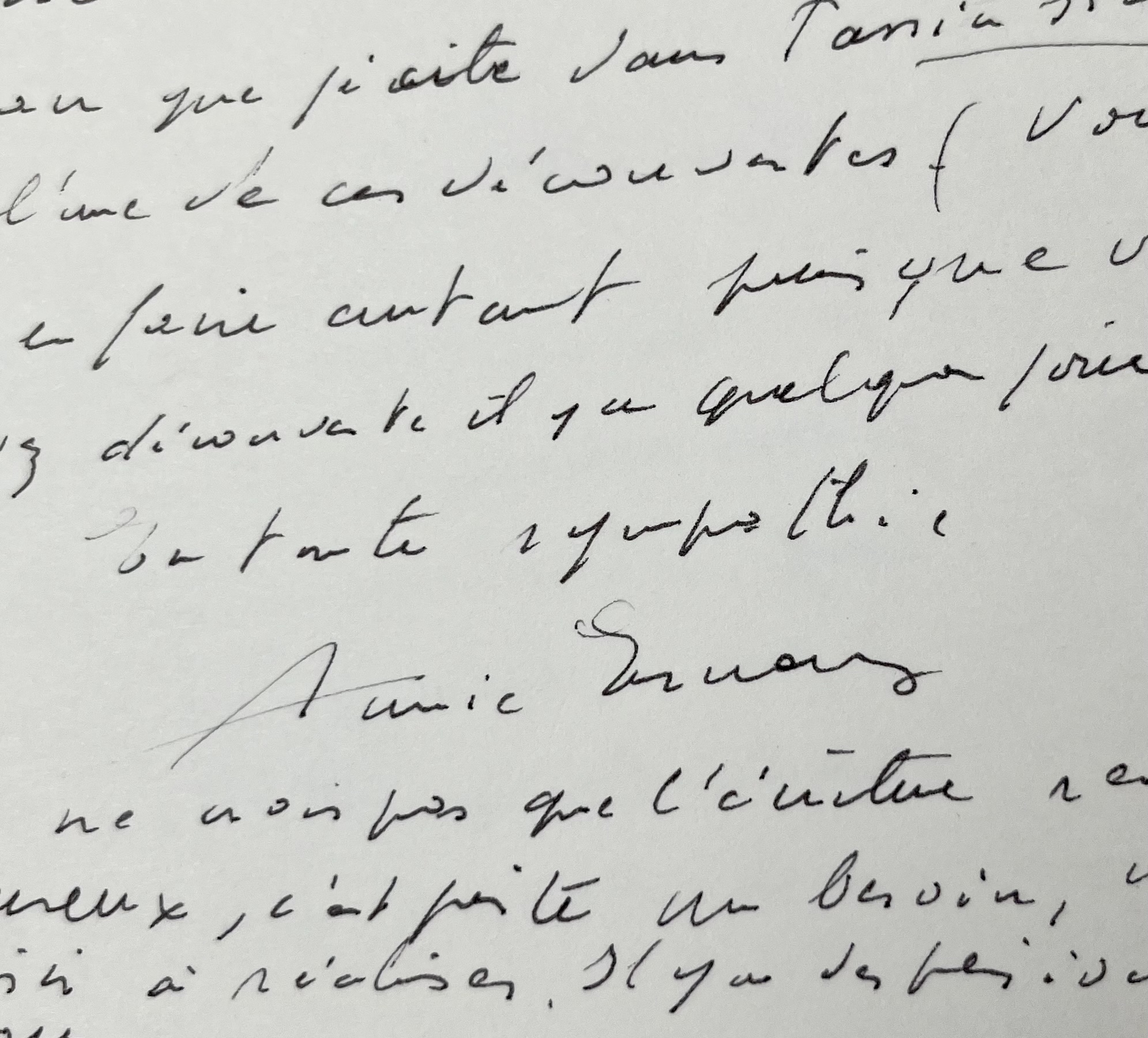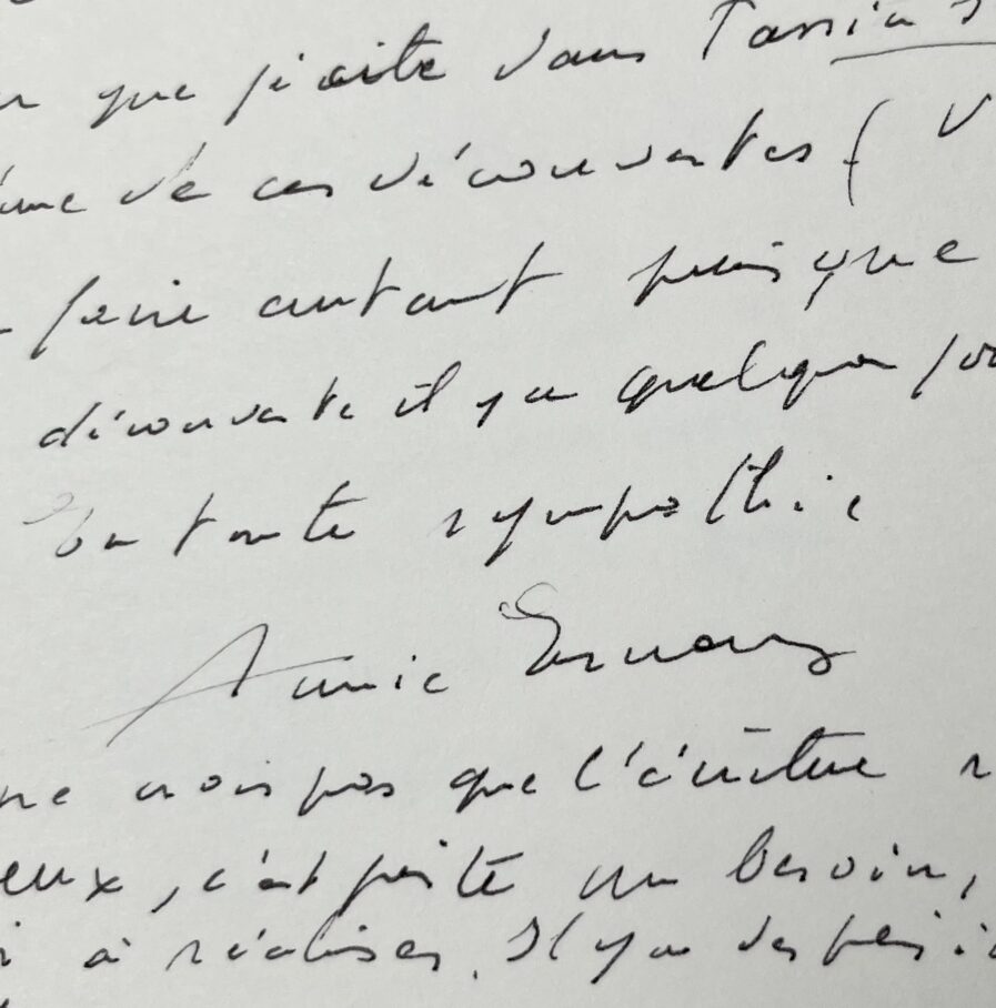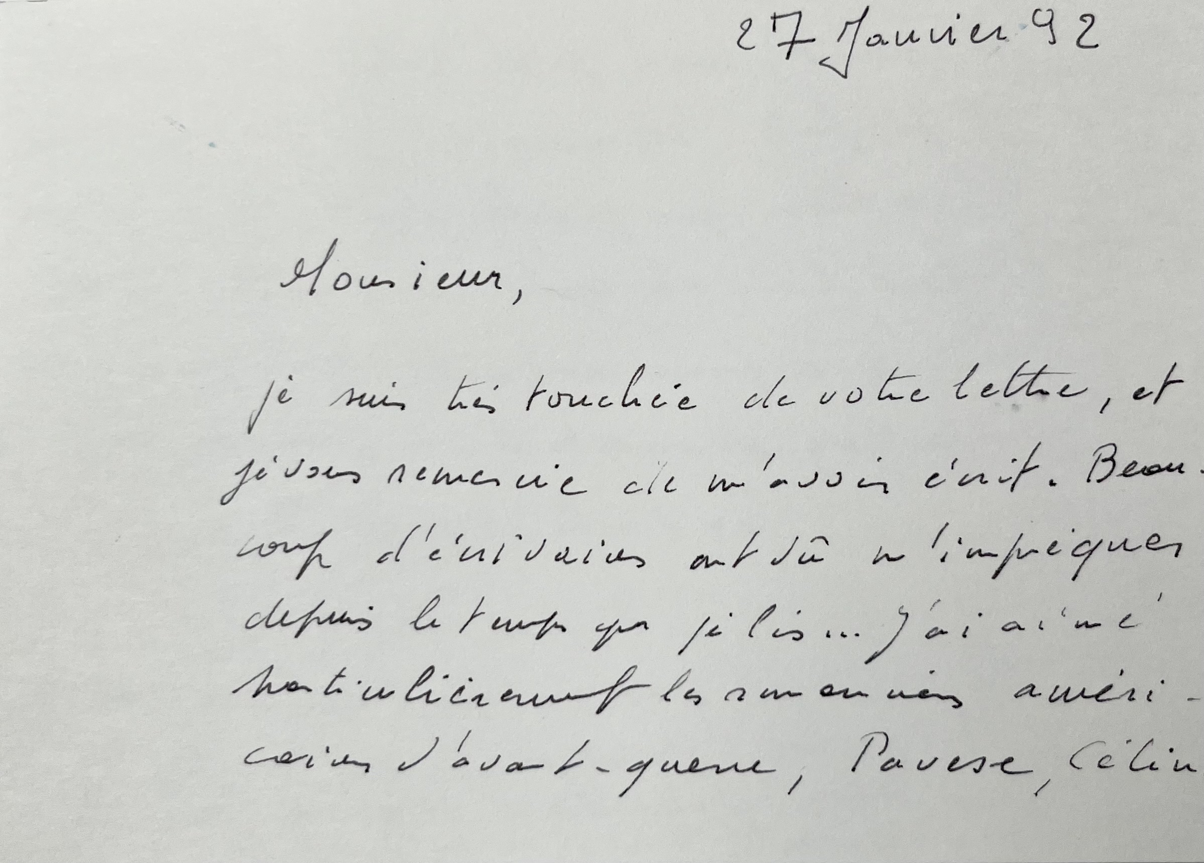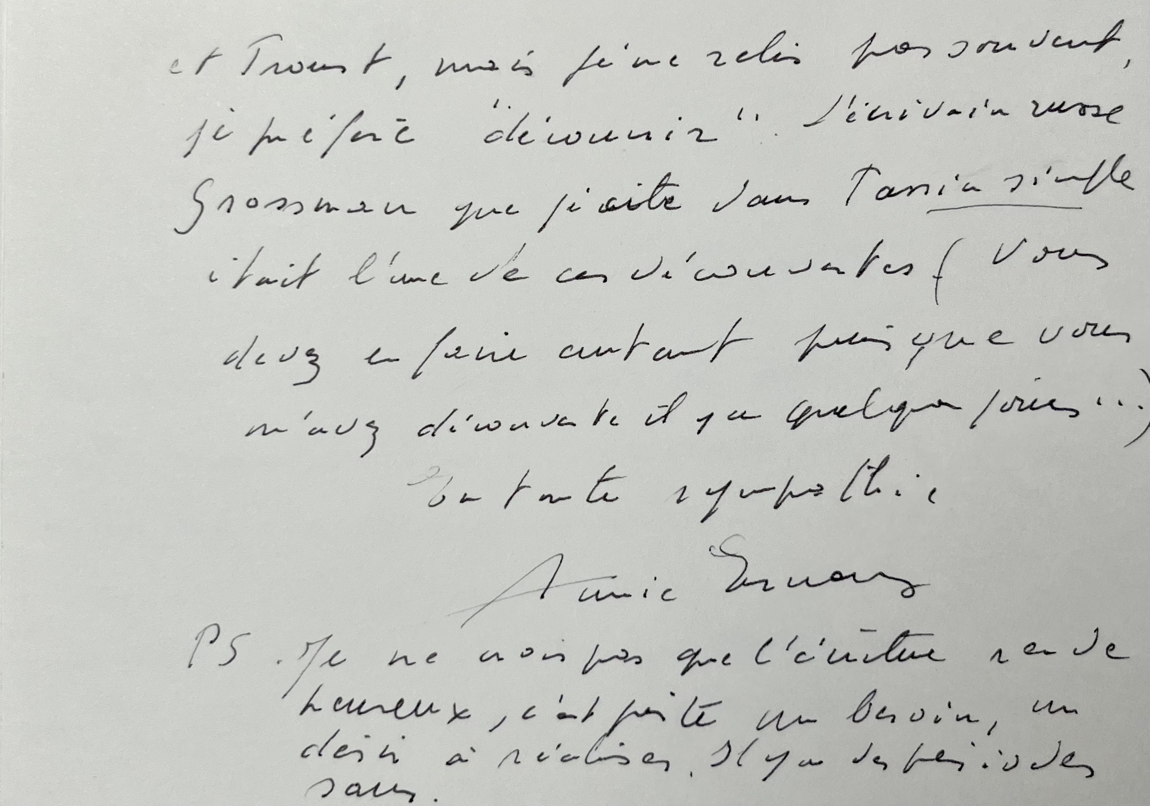 "Je suis très touchée de votre lettre, et je vous remercie de m'avoir écrit. Beaucoup d'écrivains ont dû m'imprégner depuis le temps que je lis... J'ai aimé particulièrement romanciers américains d'avant-guerre, Pavese, Céline et Proust, mais je ne relis pas souvent, je préfère "découvrir". L'écrivain russe Grossman que je cite dans Passion simple était l'une de ces découvertes. (Vous devez en faire autant puisque vous m'avez découverte il y a quelques jours...) [...]". Elle conclut dans un postscriptum "Je ne crois pas que l'écriture rende heureux, c'est juste un besoin, un désir à réaliser. Il y a des période sans".
