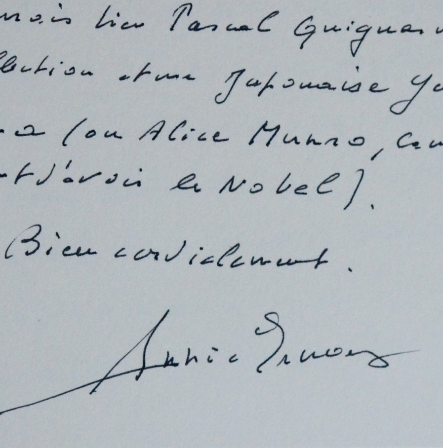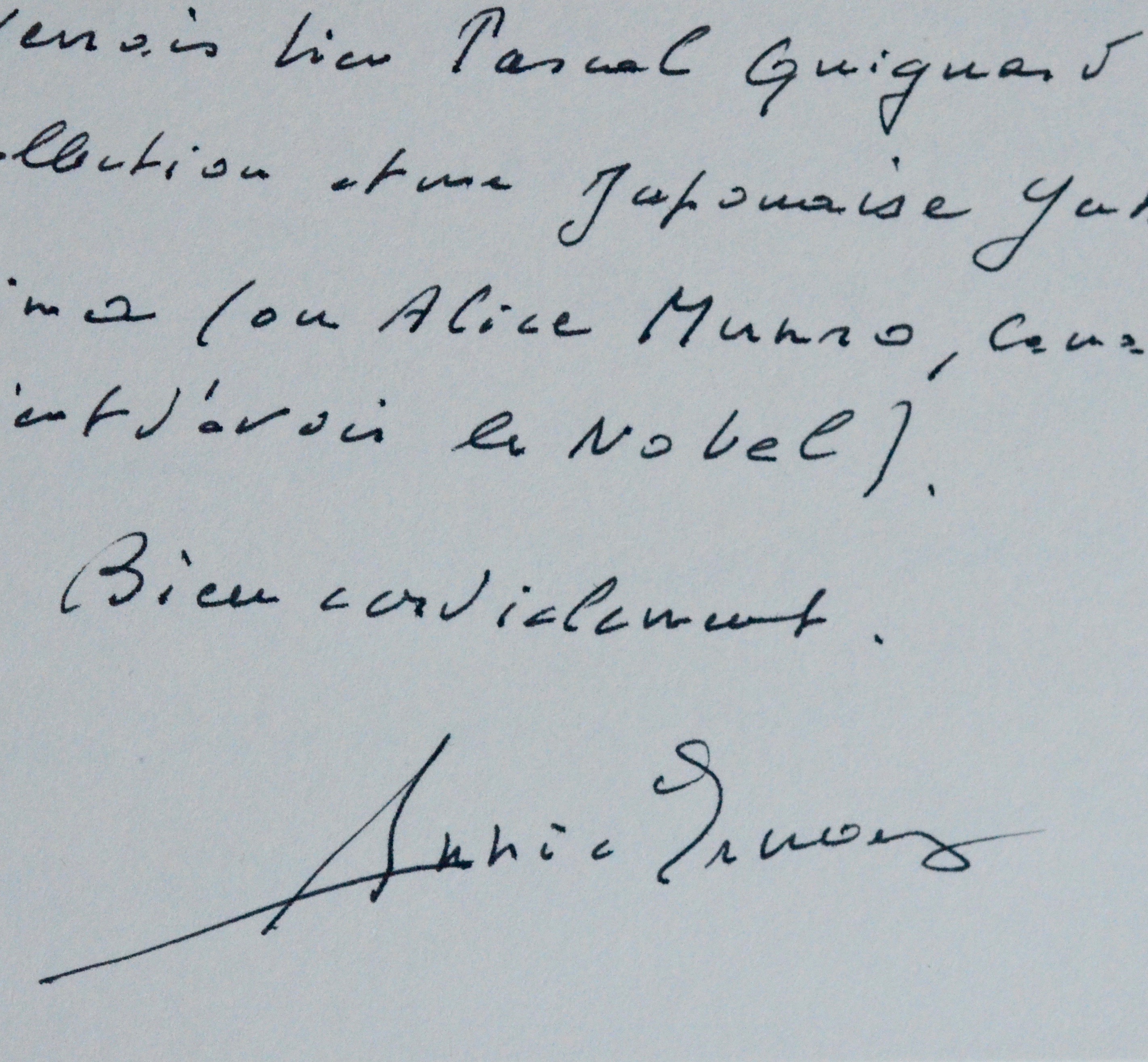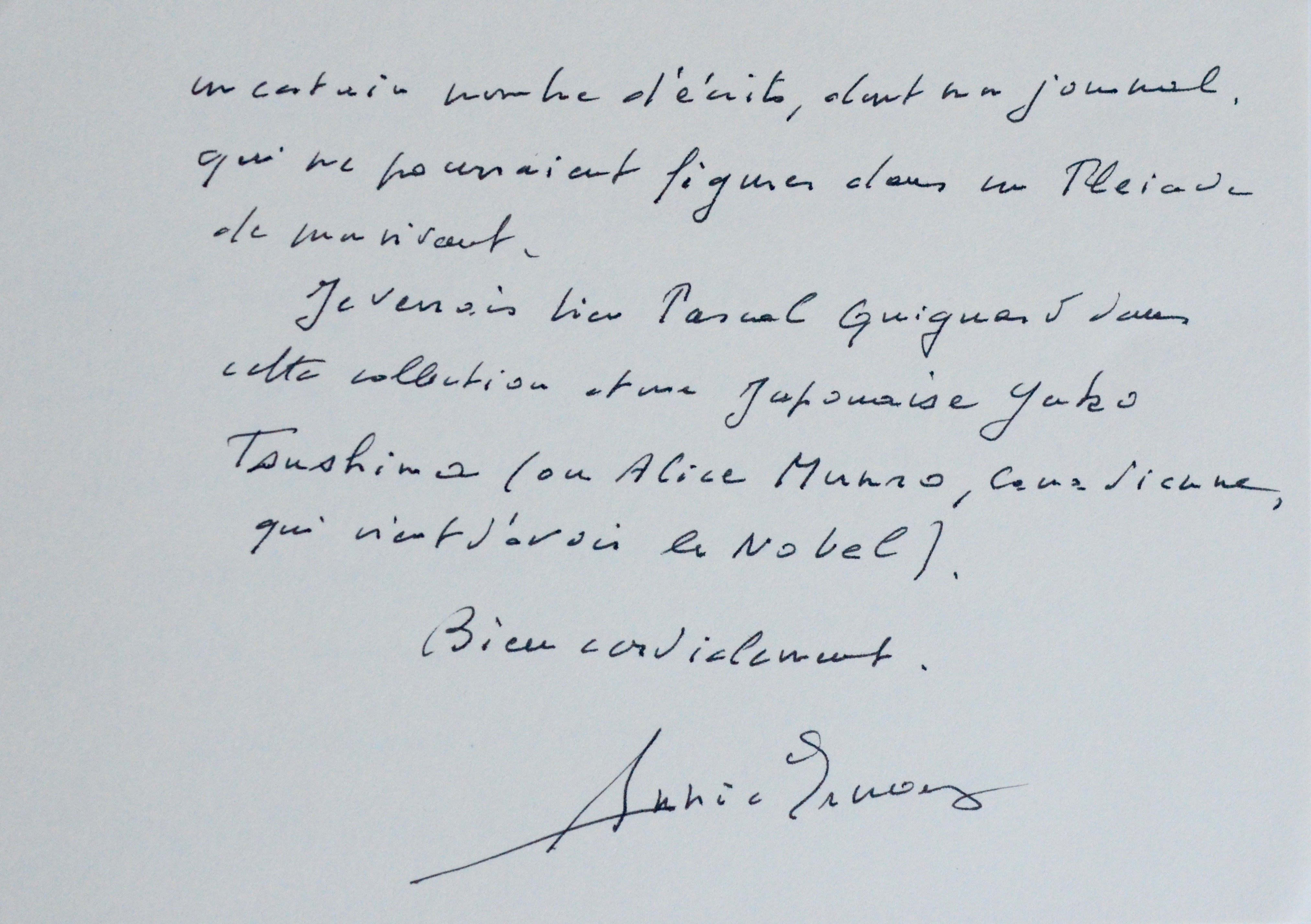 Je verrais bien Pascal Quignard dans cette collection et une japonaise Yuko Tsushima [ (ou Alice Munro [1931], canadienne qui vient d'avoir le Nobel)".
