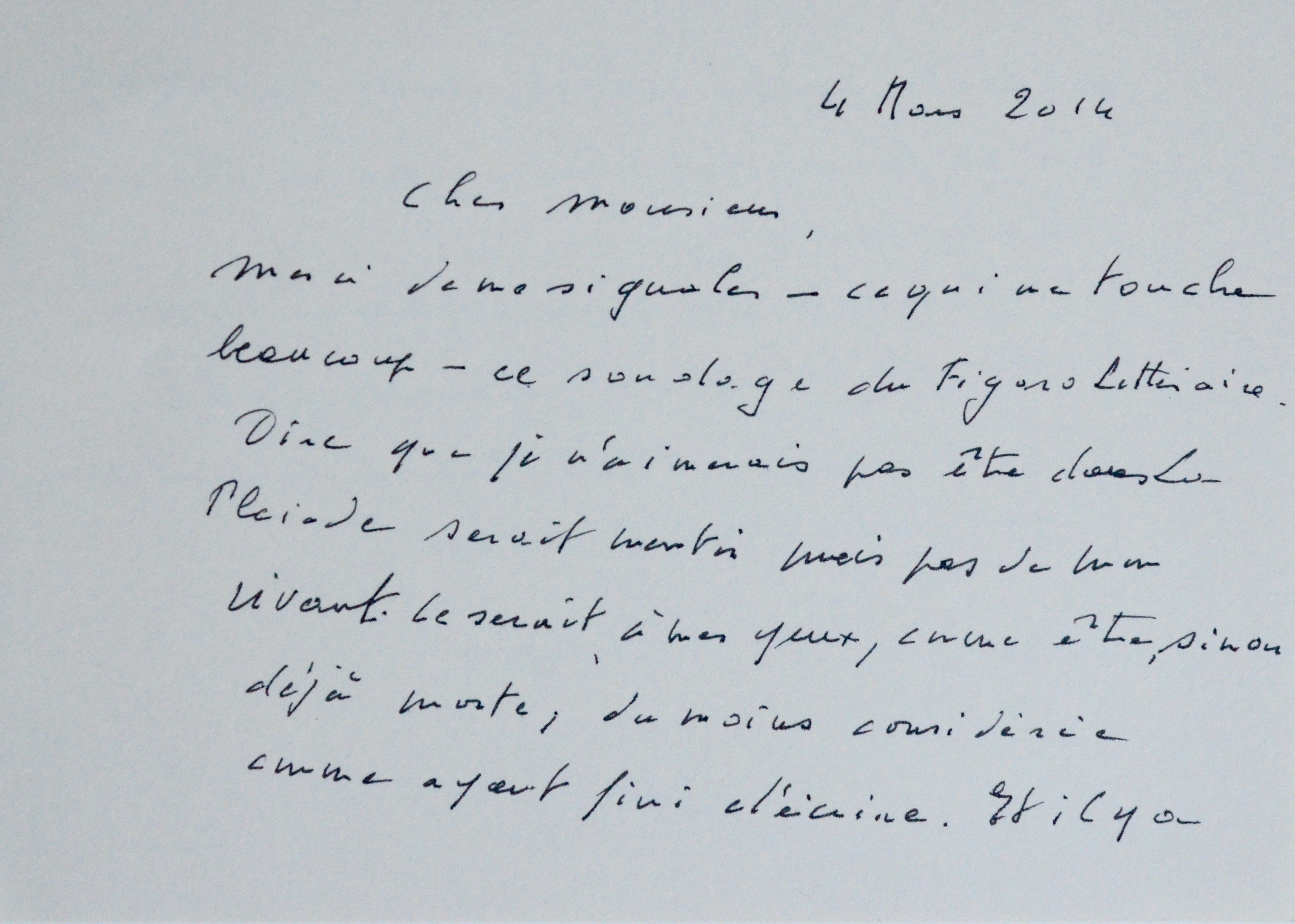 "Merci de me signaler - ce qui me touche beaucoup - ce sondage du Figaro littéraire. Dire que je n'aimerais pas être dans la Pléiade serait mentir mais pas de mon vivant. Ce serait à mes yeux, comme être sinon déjà morte, du moins considérée comme ayant fini d'écrire. Et il y a un certain nombre d'écrits, dont mon Journal, qui ne pourraient figurer dans un Pléiade de mon vivant.