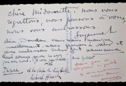 Lettre pleine d'attention, écrite et signée par 6 membres de la troupe de la Comédie française, probablement en tournée à Bruxelles entre 1956 et 1958 : parmi les signataires, on relève les noms d'Annie Girardot (qui quitta la troupe en 1958), Robert Hirsch, Jean Meyer, Suzanne L [probablement la décoratrice Suzanne Lalique], etc.