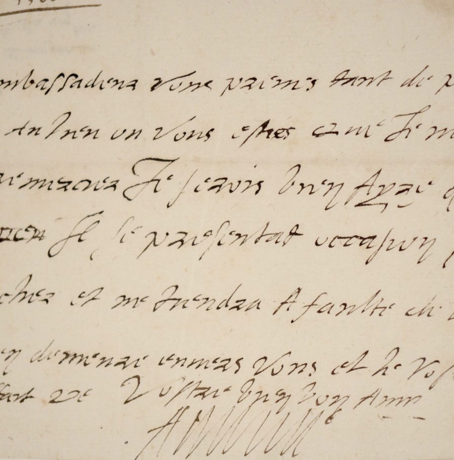 Lignes autographes : "Monsr l'ambassadeur vous prenes tant de peine pour moy ? ? vous estes que je ne serois assez vous remercier. Je serois bien ayse que par dessa il se présentat occasion pour m'en revencher et me tiendra a faulte de vous que je ne vous en donnerai envers vous [...]. Vostre bien bon amy [...]".