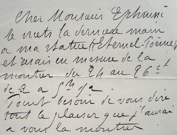 «Cher monsieur Ephrussi, je mets la dernière main à ma statue "Eternel-poème" et serais en mesure de la montrer du 24 au 26 ct [courant] de 2 à 5h1/2. Point besoin de vous dire tout le plaisir que j'aurai à vous la montrer [...]».