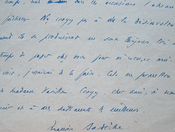 Sa belle-mère vient d'arriver à l'improviste et Maurice Bardèche se voit contraint d'annuler le rendez-vous qu'il avait avec Varillon. «Je suis désolé de ce contre-temps qui me prive de parler longuement avec vous avant mon départ, car j'ai des places pour jeudi, dans le train de Perpignan. Je suis navré surtout de n'avoir pu trouver aucun moyen de vous prévenir à temps, mais dans ces occasions l'absence de téléphone est fâcheuse [...]». [A la libération, Bardèche est arrêté comme proche de Brasillach, mais finalement relaché ; son beau-frère, par contre, est fusillé. Il sera définitivement radié de l'enseignement national].